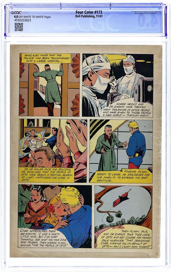Ended Jul 14 2025 Bid History 12 bids Winning Bid $84 Indicia title is "FLASH GORDON, No. 173." Cover art by Paul Norris. Adventure in Opto, art by Paul Norris; Flash and Dale's spaceship in shot down on Opto, a planet where people cannot see but are guided by radar in the headgear they wear; Flash, Dale, and a girl named Chee escape from being killed by the High Tribunal, and make their way to the winter region of Opto, where the rebel Vango is plotting a revolt against the dictator, the Regent Optik. 52 pages, full color. Cover price $0.10. Grade: CGC 4.0 explanation of grade Condition: Used (collectible)