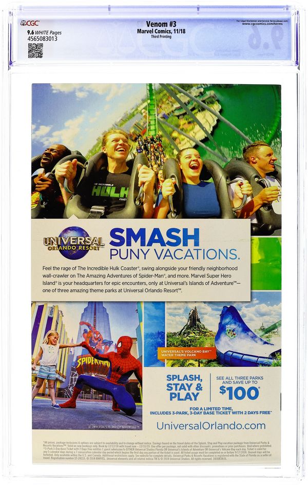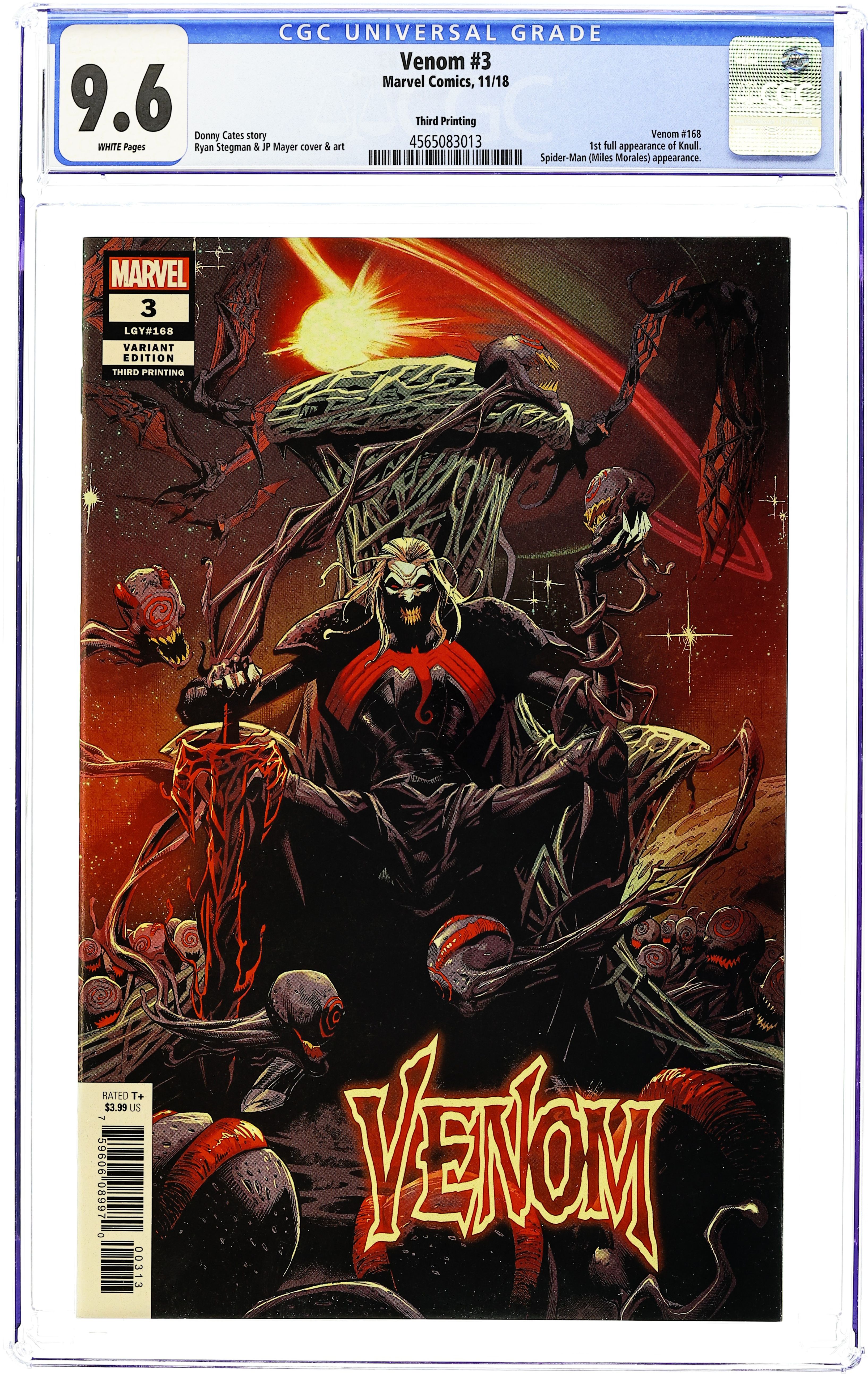 3rd Printing. Written by Donny Cates. Art and Cover by Ryan Stegman. Still recovering from his injuries, Eddie Brock - the Wicked Web-Slinger known as VENOM - has to defend NYC against the most powerful foe he's ever faced! The only thing standing in his way? Miles Morales…SPIDER-MAN! Though Eddie and the symbiote have no qualms with this particular web-slinger, the same can't be said for Miles' feelings about Venom… 28 pages, full color. Rated T+ Cover price $3.99. Grade: CGC 9.6 explanation of grade Condition: Used (collectible)