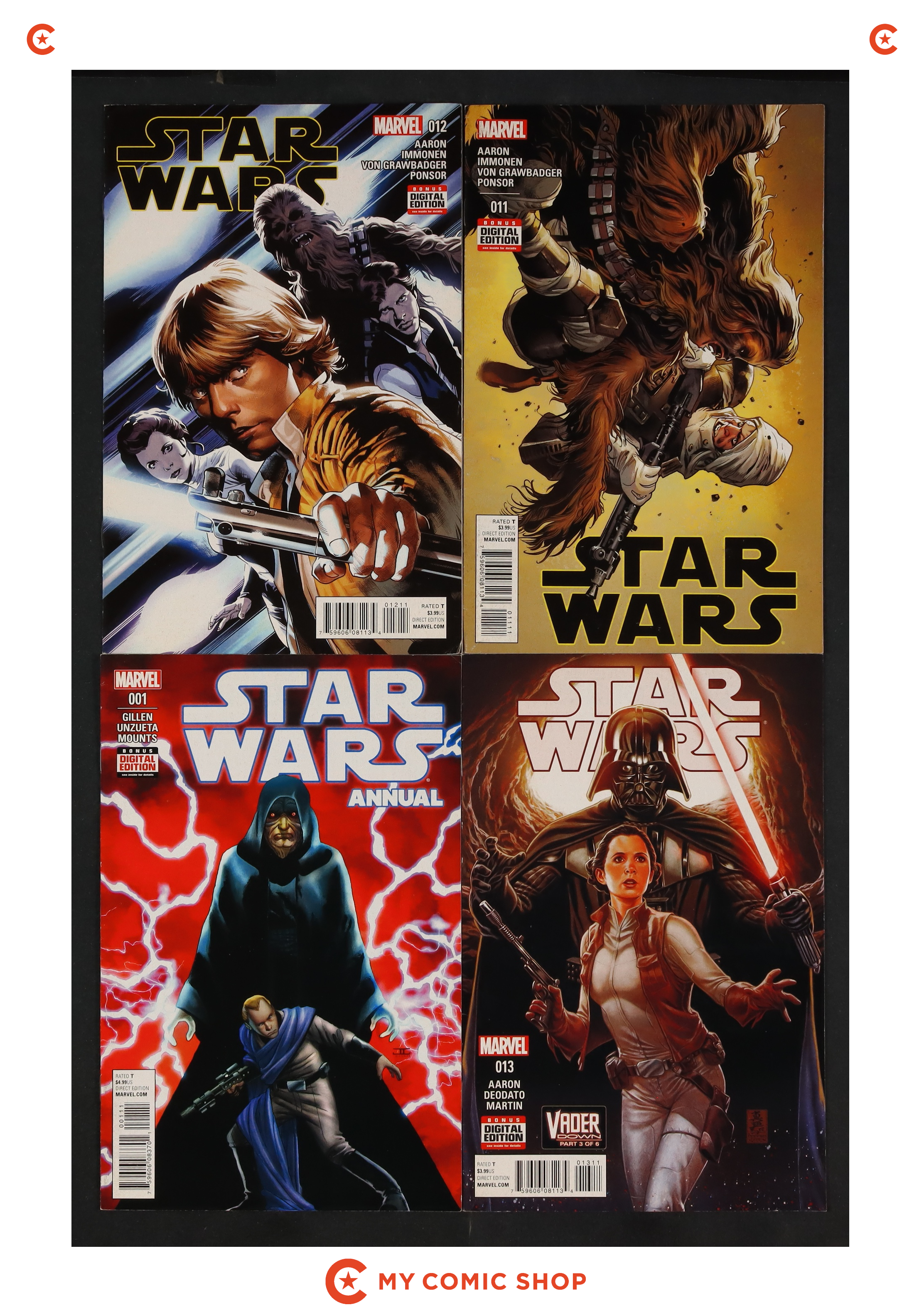 Issues 1A-13A and Annual 1A of Star Wars (2015 Marvel). Most will grade in the FN- to VF+ range.