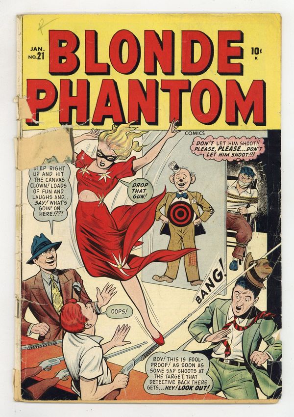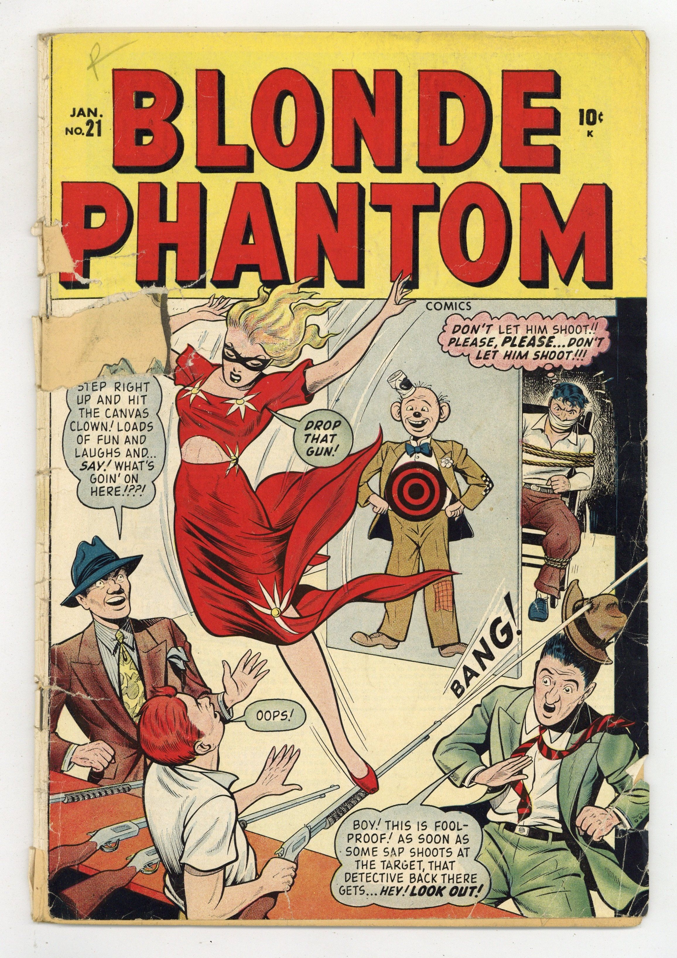 Stories by unknown. Art by Vince Alascia and unknown. The Blonde Phantom stars in "Kidnapped Into the Future!" with inks by Vince Alascia, and "The Thing That Haunted Hawkins Lake!" Also in this issue: the Sub-Mariner in "The Metal Men of the Moon!"; 2-page text story "Tougher than Most"; and "A Letter to Our Readers and Their Parents!" Characters in this issue: Blonde Phantom; Kall (first appearance, villain); Sub-Mariner [Prince Namor]. 36 pages, full color. Cover price $0.10. Grade: FR/GD 1.5 explanation of grade Condition: Used (collectible)