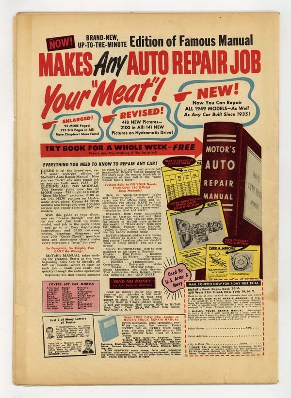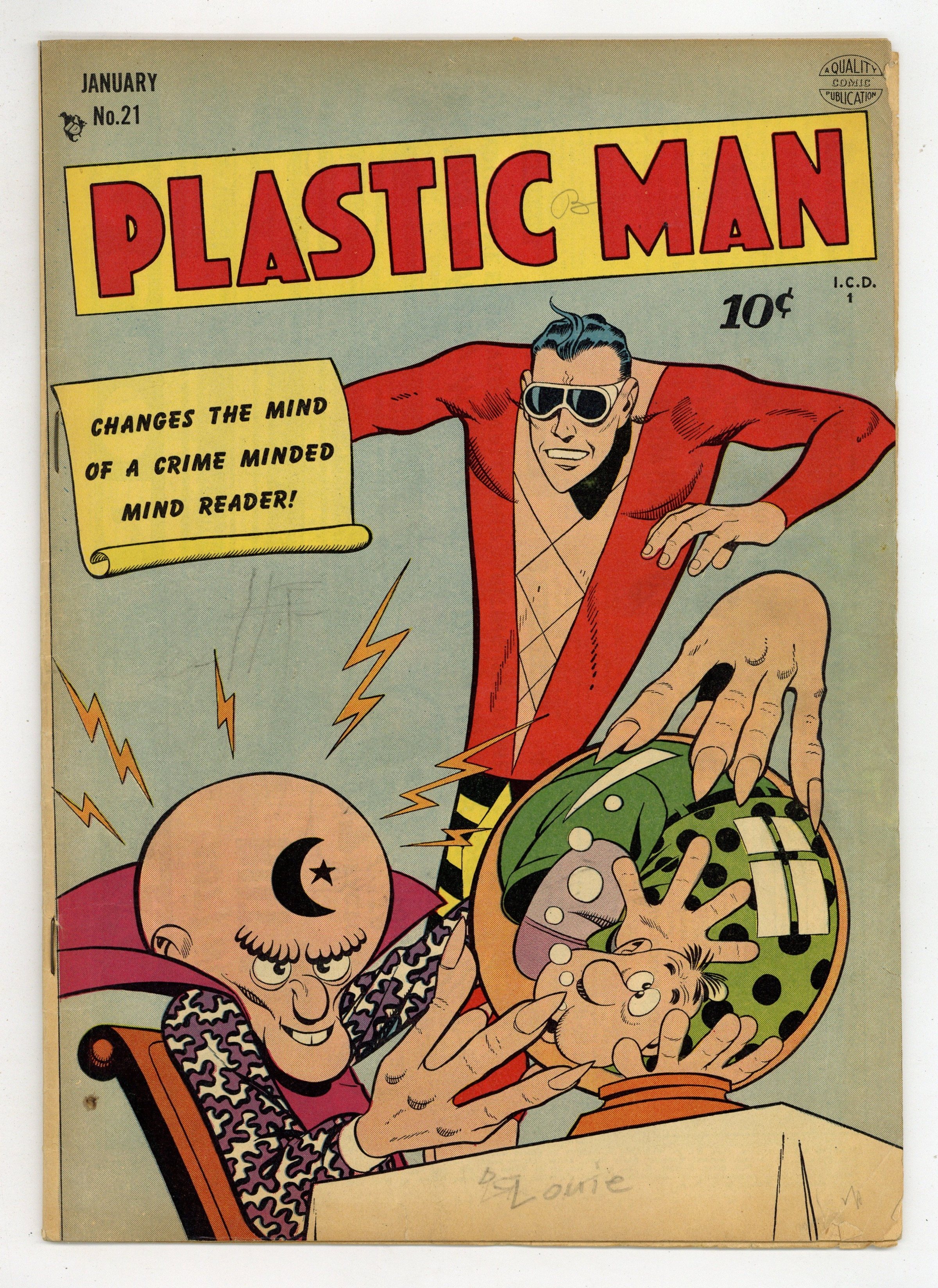 Cover art by Jack Cole. Kra Vashnu starring Plastic Man, script by Bill Woolfolk, art by Jack Cole. Professor Putter's Potion starring Woozy Winks and Professor Putter, art by Jack Cole. Misunderstanding text story with Plastic Man. Where Is Amorpho?, script by Bill Woolfolk, art by Jack Cole; A projectile from space brings to Earth an indefinable mass of protoplasm called Amorpho, who can reshape his body into any animal or human alive; His downfall, at the hands of Plastic Man, is his insane desire for salt! Plastic Man agreed to drop charges if Amorpho would go back home. 36 pgs. $0.10. Cover price $0.10. Grade: VG- 3.5 explanation of grade Condition: Used (collectible)