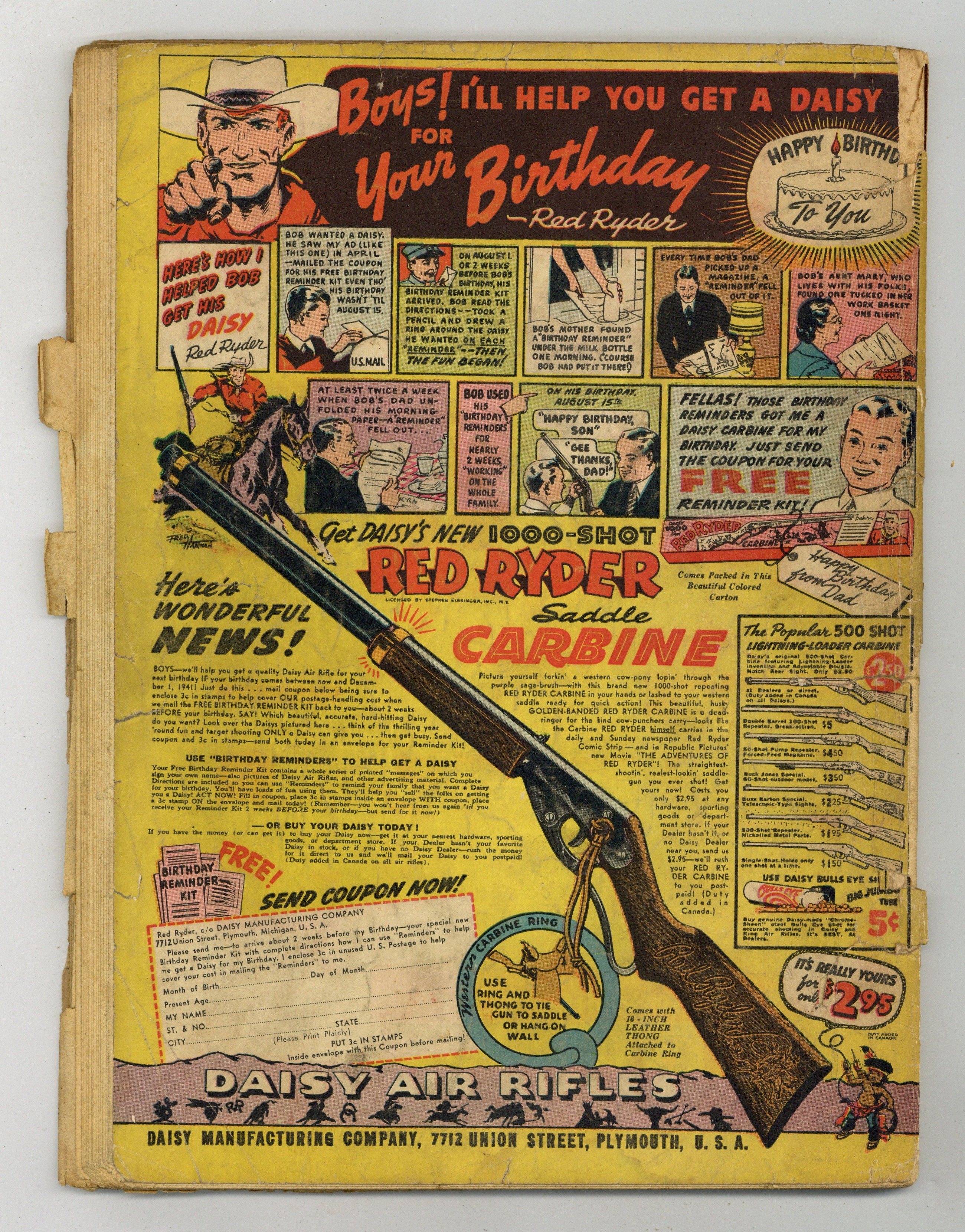 - INCOMPLETE. Heavy tearing with pieces missing from two center wraps, slightly interrupts art and story. 6" cumulative spine split. Centerfold detached.