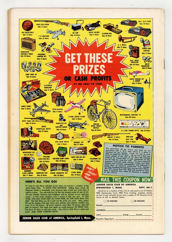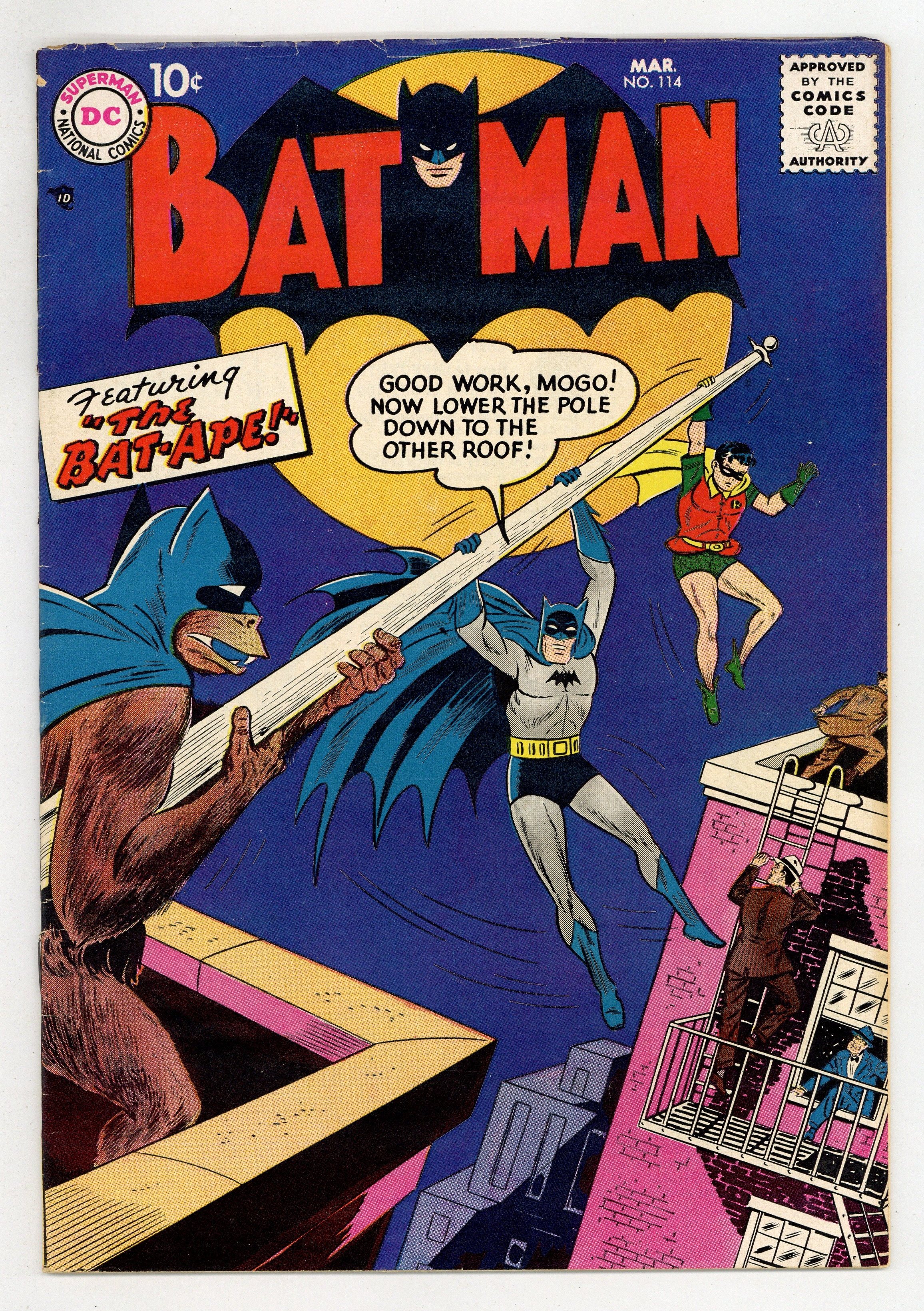 Cover by Sheldon Moldoff. "The Secret of Mechanical City," script by Bill Finger, pencils by Dick Sprang, inks by Charles Paris; The Caped Crusaders and Professor race one another to Mechanical City to retrieve a stolen secret formula on microfilm. One-page Warden Willis story by Henry Boltinoff. Do You Know What's Behind a Law? public service announcement, art by Bob Brown. "The Mirage Maker," pencils by Sheldon Moldoff, inks by Charles Paris; The Caped Crusaders battle a wily foe who can create illusions, which stumps Batman until he finds a way to combat these mirages with radar. One-page Casey the Cop story by Henry Boltinoff. "The Invisible Patrolman" text story. "The Bat-Ape," pencils by Sheldon Moldoff, inks by Charles Paris; An animal trainer at a circus is arrested for robbing the box office since an ape provided a distraction; However, Batman seeks to prove the man's innocence, using the ape as a cowled assistant. 36 Pages, Full Color. Cover price $0.10. Grade: VG- 3.5 explanation of grade Condition: Used (collectible)