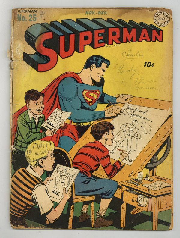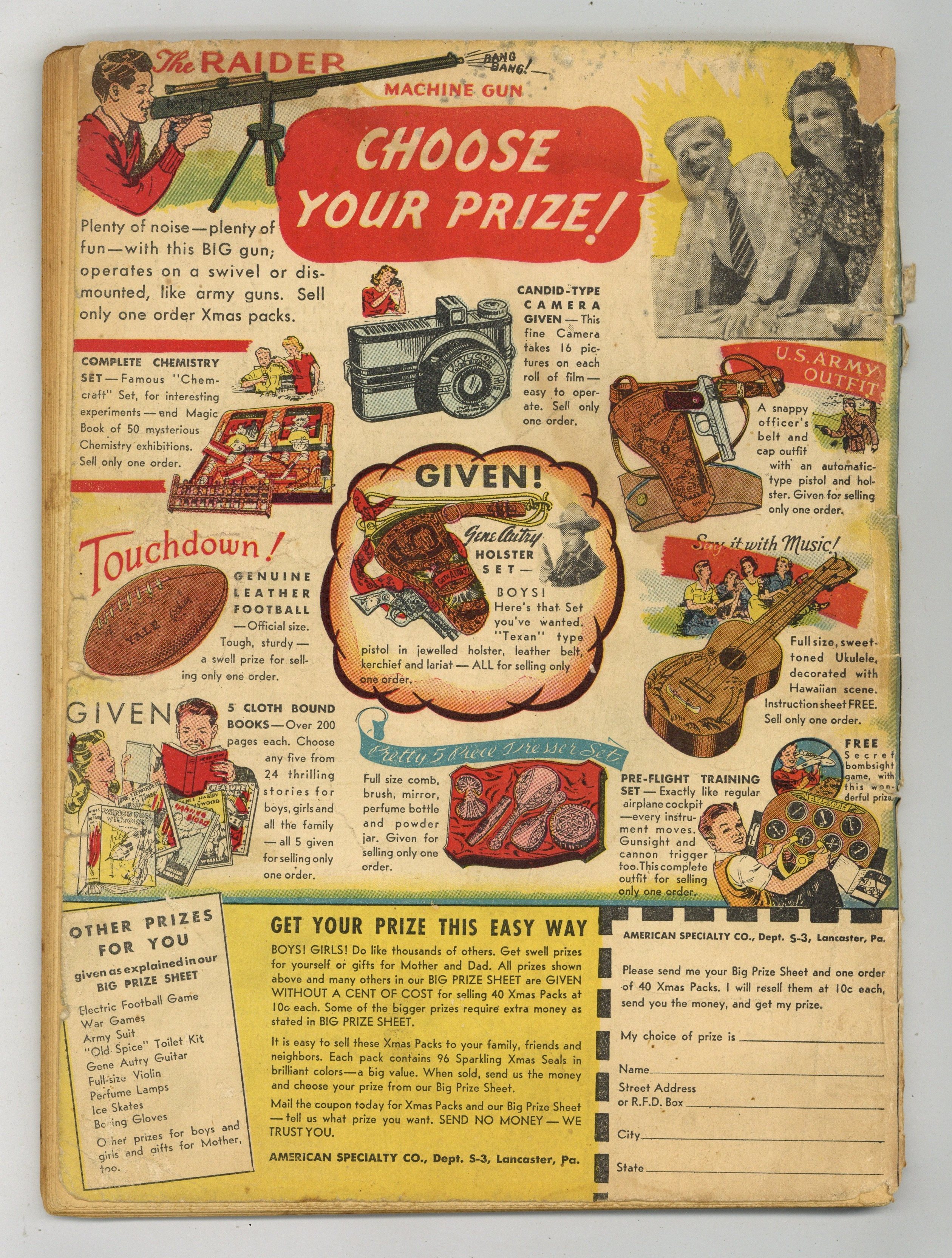 Cover art by Jack Burnley. The Man Superman Refused To Help!, script by Jerry Siegel, pencils by Ira Yarbrough [as Joe Shuster]; Superman helps to clear a World War I veteran who is accused of being the secret head of a subversive Fifth Column organization. I Sustain the Wings!, script by Mort Weisinger, art by Fred Ray. Private Pete humor page by Henry Boltinoff. King of the Comic Books!, script by Jerry Siegel, pencils by Joe Shuster, inks by Ira Yarbrough [as Shuster]; Superman takes on the persona of a fictional super hero in order to save the life of the character's creator from the Nazis. Fair Exchange text story by Robert Lane. How They Knock Out a Jap Machine Gun Nest fact/propaganda page by Jack Lehti. Hi-Jack--Jackal of Crime!, pencils by Ed Dobrotka [as Joe Shuster], inks by George Roussos [as Shuster]. 60 Pages, Full Color. Cover price $0.10. Grade: FR 1.0 explanation of grade Condition: Used (collectible)