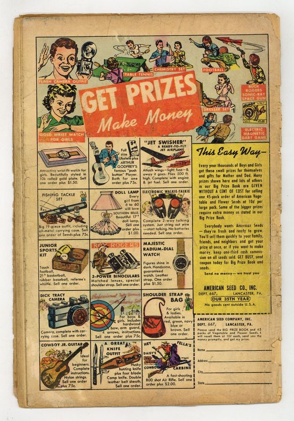 Cover art by Bill Everett. "The Specimen!", art by Joe Maneely; A scientist plots to use a mermaid from Atlantis to gain world renown and so he lies to her that he loves her until he can build an escape-proof tank; Unfortunately for him, she has the exact same intentions for him and drags him down to Atlantis so they can use him as a specimen to model how human males appear in order to create an invasion force. "Hunger," pencils by Ben Brown, inks by David Gantz; A butcher poisons his ex-partner's meat locker in order to drive him out of business but then comes back later to make sure he did not leave any evidence behind and gets himself locked in; Over the course of several days he waits for someone to come and let him out, but no one comes. "Ashes to Ashes!", pencils by Al Eadeh; A woman burns her uncle to death before learning that the directions to his fortune are tattooed in a map upon his back. "The Broken Step" text story. "The Man in the Morgue," art by Vic Dowling; A hoodlum spends his last buck for a psychic reading and is told that his luck will change; After spending the night in an alley with nothing to eat an elderly man approaches him and he strangles him in order to rob him; The cops give chase and gun him down; The police wonder why the elderly man was in such a rundown area. "Lost!", art by Pete Tumlinson; Criminals hide loot in a cave and one is arrested and serves a jail sentence of twenty years; When he is released he goes back to the cave and shoots the man and woman who were lost in there for twenty years, but their son kills him. 36 pgs., full color. Cover price $0.10. Grade: FR 1.0 explanation of grade Condition: Used (collectible)