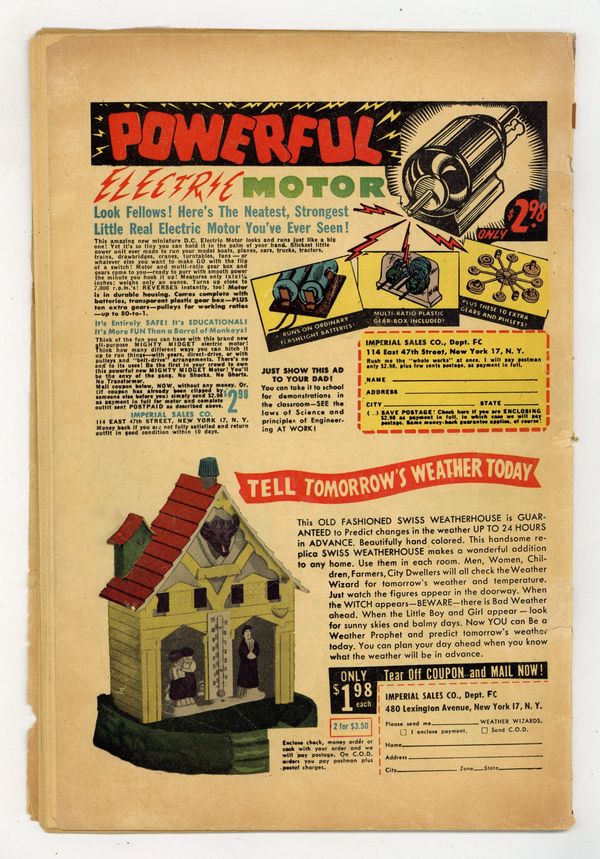 Stories and art by H. C. Kiefer and others. American space hero Rocketman battles interstellar menaces in the year 25,000 AD, traveling the galaxy in his ship, the Solar Bird. A spaceship crashes on the planet Manon, where the survivors are enslaved by Malok until Rocketman hears about it. Rocketman investigates when Plutonians abduct the king of Saturn to steal his brainwaves, with art featuring some fun futuristic machinery. Wings of Evil; Venus Afire; Goofy Knights; Goodbye Earth; The Invisible Terror; Dopey Don: Arithmetic Lesson; Panic on Pluto. Final issue under this title; numbering continues with Strange Fantasy (1952) #1, sometimes listed as issue #2. 32 pages, Full Color. Cover price $0.10. Grade: FR 1.0 explanation of grade Condition: Used (collectible)