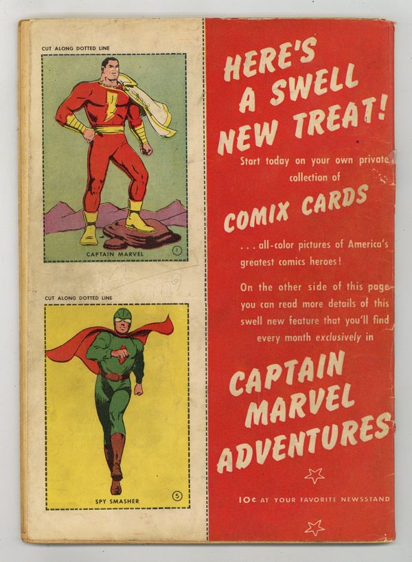 Stories and art by Dave Berg, Mac Raboy and Emil Gershwin. One of Fawcett's most popular superheroes, Spy Smasher fights saboteurs, fifth columnists, Quislings and collaborators during WWII. Spy Smasher discovers the vampire weapon of the Third Reich known as The Terror in Exile. In a story by future Mad "Lighter Side" artist Dave Berg, Sir Butch takes on neighborhood tyrant Floda Reltih (spell it backwards). Spy Smasher aids The Komitaji, Yugoslav guerilla fighters of the Resistance. Contents page art by Mac Raboy. Cover features a photo promoting the Spy Smasher Republic movie serial. (Fawcett's characters pioneered the live-action superhero movie.) The Terror in Exile; Death Visits the Dentist; The Adventure of the Golden Wasp. 64 pages, Full Color. Cover price $0.10. Grade: GD 2.0 explanation of grade Condition: Used (collectible)
