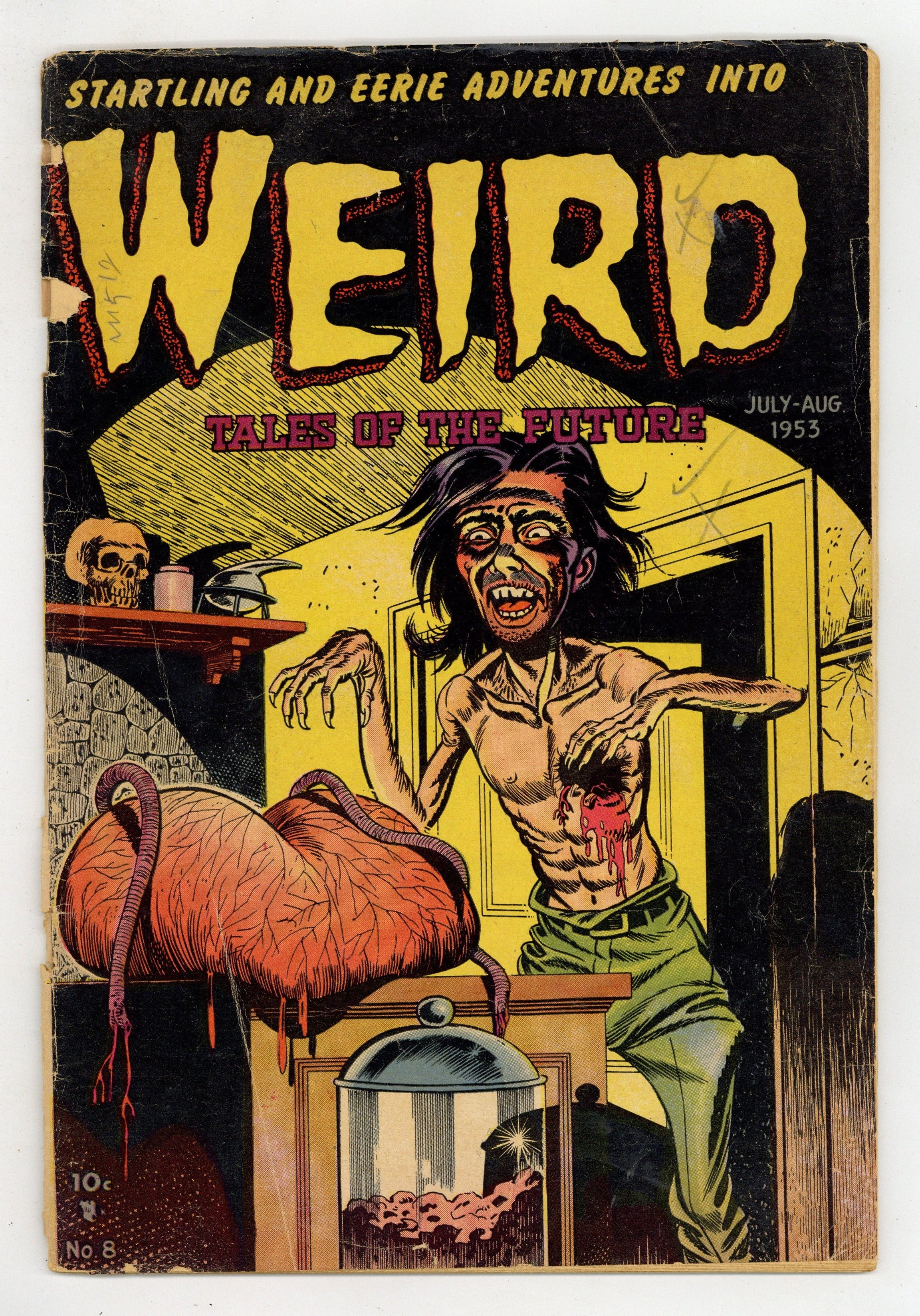 Gory cover by Bernard Bailey shows a man with his heart ripped out. Interiors reprint Weird Mysteries # 1: "High Voltage" (art by Hy Fleishman), "The Planet Eaters," "Death Takes a Holiday" (art by Nick Frank), "A Stone's Throw From Eternity," "The Spirits From Outer Space!" Edited by Stanley Morse. Stories by Fleishman, Frank Frollo, Frank, Loffredo, Walter Palais, and Mike Esposito. Futuristic science fiction, sometimes with elements of horror—these are Weird Tales of the Future! 36 pages, full color. Cover price $0.10. Grade: FR 1.0 explanation of grade Condition: Used (collectible)
