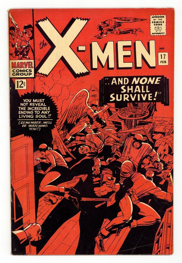 Ended Aug 18 2025 Bid History 12 bids Winning Bid $71 Cover pencils by Jack Kirby, inks by Dick Ayers. ...And None Shall Survive!, script by Stan Lee, pencils by Jack Kirby (p. 1 & layouts, pp. 2–20) and Werner Roth [as Jay Gavin] (pp. 2–20), inks by Dick Ayers; In the aftermath of their battle with the Sentinels, Hank, Bobby and Scott are taken to the hospital with injuries; Iceman is delirious in a coma but his companions recover quickly; When Warren's parents call and say they are dropping by for a visit, Angel flies back to the mansion where he is attacked by a mysterious stranger; Xavier and Cyclops, worried with no word from Angel, also return home and are attacked; Beast and Jean are the last to show up and are also taken down; As Warren's parents arrive at the mansion, they are greeted by Magneto. 36 pgs. $0.12. Cover price $0.12. Grade: VG- 3.5 explanation of grade Condition: Used (collectible)