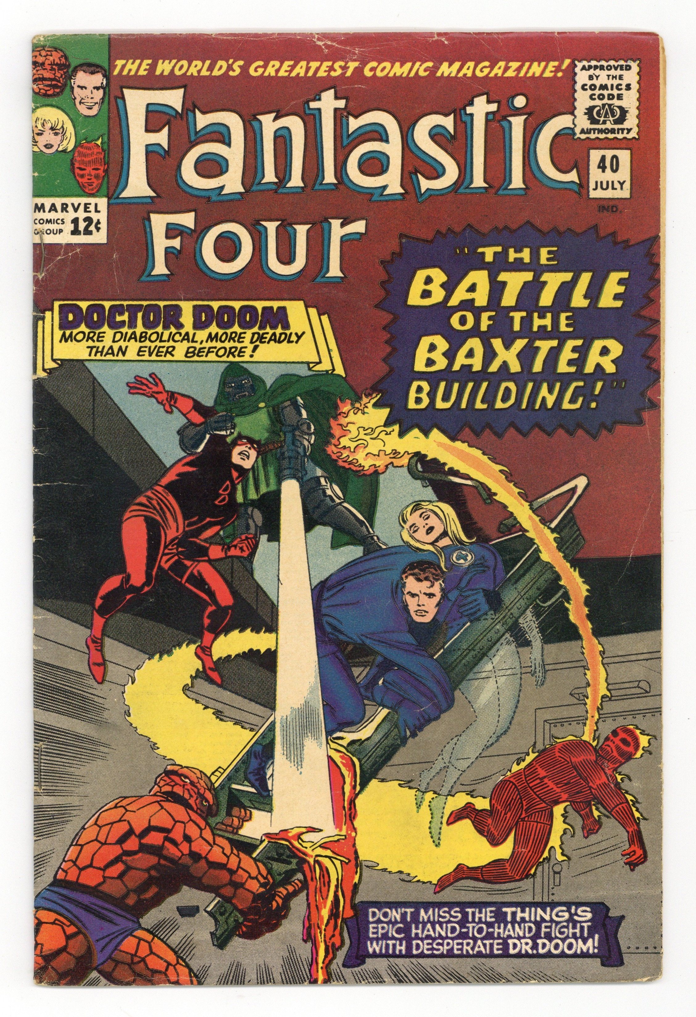 Cover pencils by Jack Kirby, inks by Frank Giacoia. The Battle of the Baxter Building, script by Stan Lee, pencils by Jack Kirby, inks by Vince Colletta; Dr. Doom battles the FF and Daredevil; Reed restores the FF's powers. 36 pgs. $0.12. Cover price $0.12. Grade: VG- 3.5 explanation of grade Condition: Used (collectible)