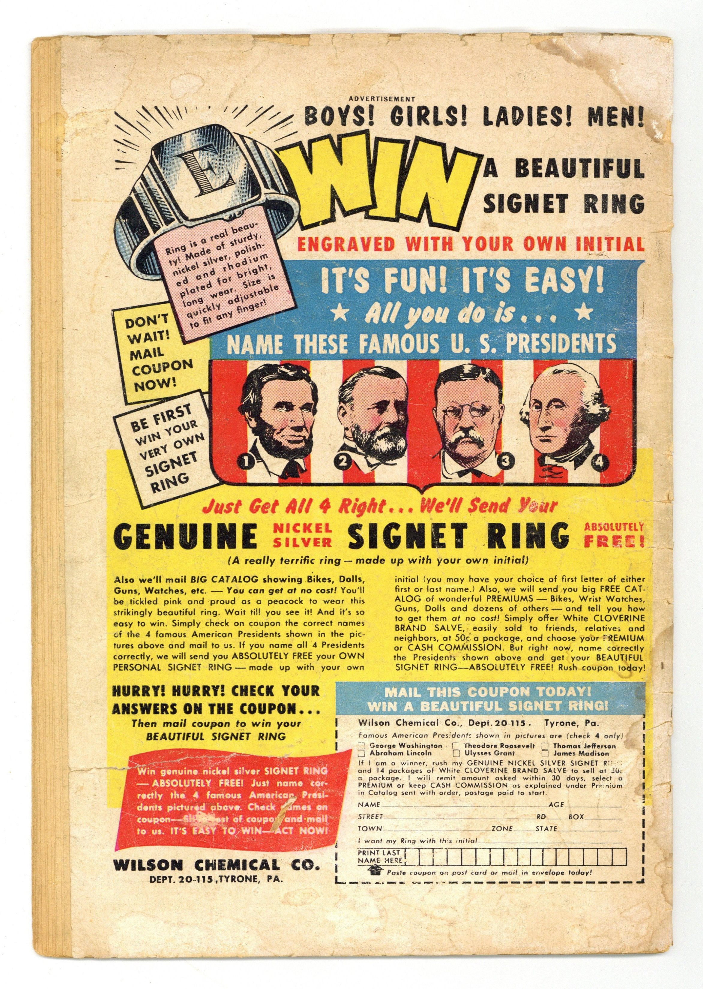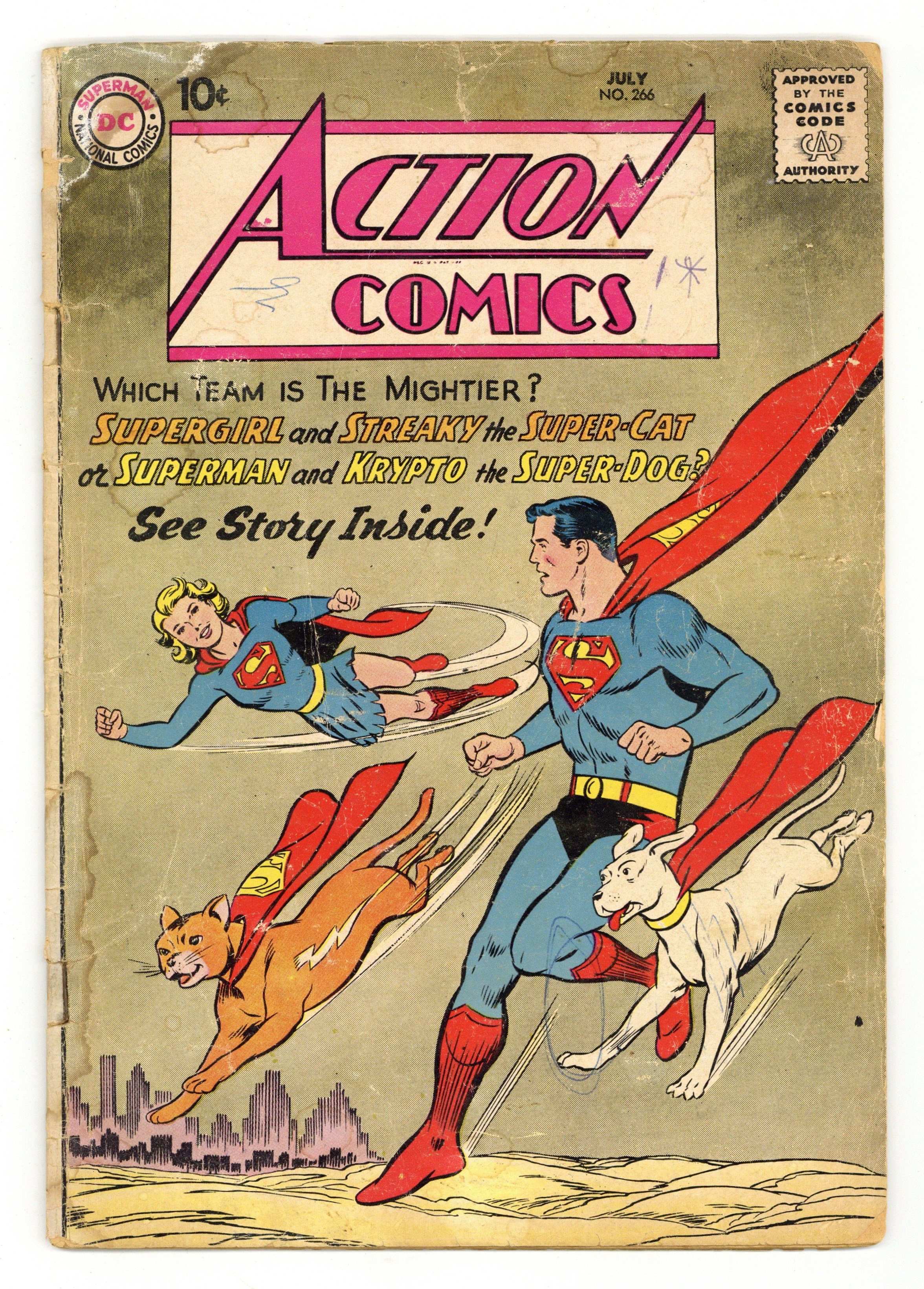 Cover pencils by Curt Swan, inks by Stan Kaye. "Captive of the Amazons," script by Jerry Siegel, pencils by Wayne Boring, inks by Stan Kaye; Princess Jena from the planet Adoria comes to Earth and tricks Superman into returning to Adoria with her, where she forces him to marry her. One-page Jerry the Jitterbug story by Henry Boltinoff. "The World's Mightiest Cat!", script by Jerry Siegel, art by Jim Mooney; Streaky again becomes super-powered and nobody believes the things Paul sees him perform. Supermen of America ad. Green Lantern ad. 36 Pages, Full Color. $.10 Cover price $0.10. Grade: GD- 1.8 explanation of grade Condition: Used (collectible)
