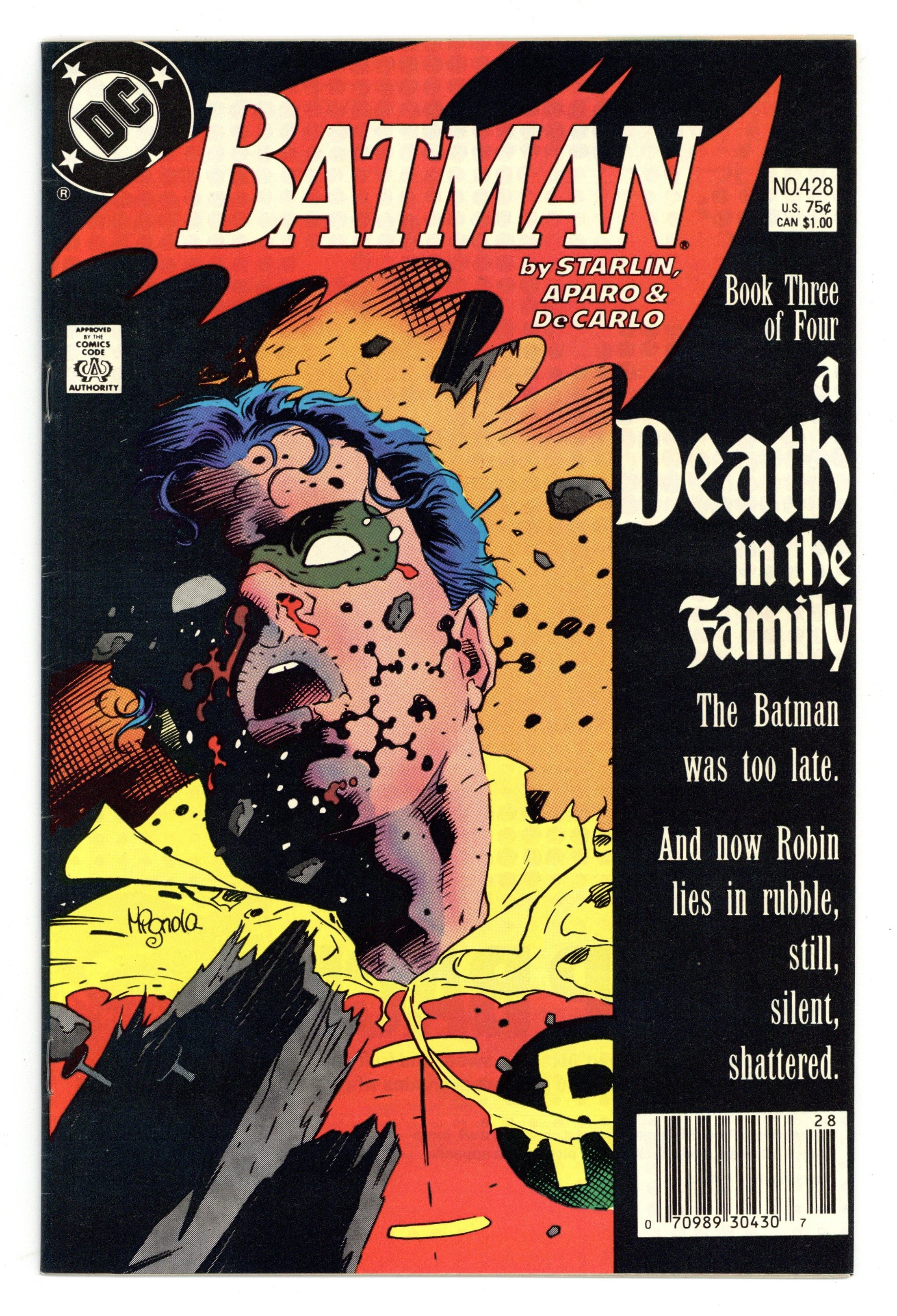 Ended Jul 28 2025 Bid History 20 bids Winning Bid $34 First printing. Newsstand Edition. Cover art by Mike Mignola. "A Death in the Family" part 3 of 4, script by Jim Starlin, pencils by Jim Aparo, inks by Mike DeCarlo; Death of Sheila Haywood; Burial of Sheila Haywood and Jason Todd; The Joker becomes the Iranian Ambassador to the U.N. Results of Phone Poll as to whether Robin dies this issue or not. NOTE: Most issues from 397-432 were reprinted in 1989 and sold in multipacks. These 2nd and 3rd prints have back cover ads dated 1989. 36 Pages, Full Color. Cover price $0.75. Grade: FN 6.0 explanation of grade Condition: Used (collectible)