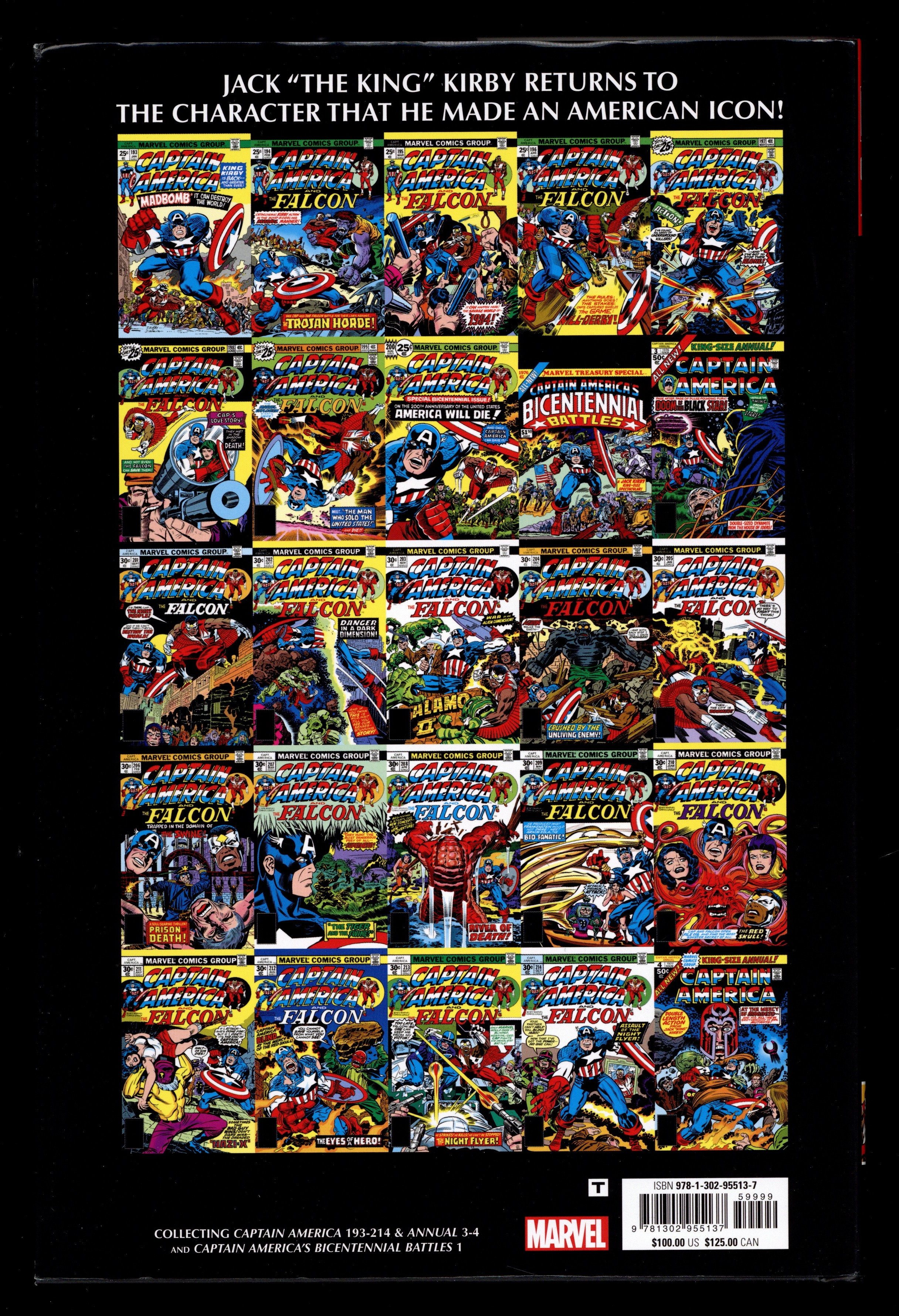 1st Edition - Volume 4 - 1st printing. Collects Captain America (1968-1996 1st Series) #193-214, Captain America (1968-1996 1st Series) Annual #3-4, Captain America's Bicentennial Battles (1976 Marvel Treasury), and material from F.O.O.M. (1973 Marvel) #11. Written by Jack Kirby. Art by Jack Kirby, Frank Giacoia, D. Bruce Berry, John Verpoorten, Barry Windsor Smith, Herb Trimpe, John Romita, Dan Adkins, Mike Royer, Dan Green, and John Tartaglione. Cover by Jack Kirby and Frank Giacoia. It's the return of the King! In 1975, Jack "King" Kirby returned to Marvel and his iconic co-creation Captain America. Serving as writer, artist and editor, it was Kirby unleashed! He created an intricate storyline that built month after month toward America's Bicentennial and CAPTAIN AMERICA #200. In the "Madbomb" saga, an aristocratic faction seeks to wrest control of the country by possessing the American people's minds - and driving them to insane outbreaks of violence! Then, the Falcon is lost in an other-dimensional asylum - that's run by the inmates! The tale of the Night People and Agron the Unburied One is a tense, sci-fi/horror thriller. And Kirby tops it all off with "The Swine," an action-packed adventure featuring the debut of Arnim Zola - and the return of the Red Skull! Hardcover, 656 pages, full color. Rated T Cover price $100.00. Grade: NM 9.4 explanation of grade Condition: Used (collectible)