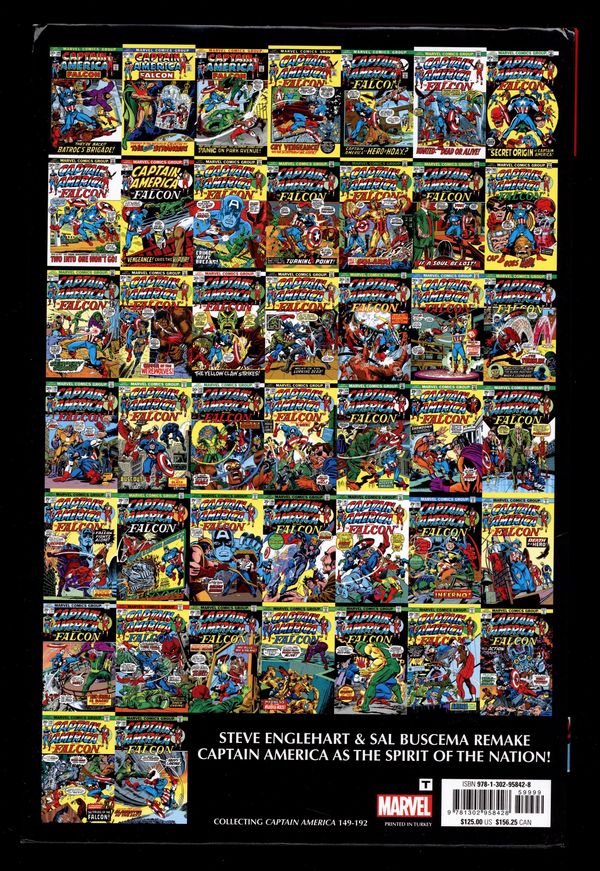 2nd Edition - Volume 3 - 1st printing. Collects Captain America (1968-1996 1st Series) #149-192. Written by Steve Englehart, Gerry Conway, Steve Gerber, Roy Thomas, Tony Isabella, Mike Friedrich, John Warner, Bill Mantlo, and Marv Wolfman. Art by Sal Buscema, Frank Robbins, John Romita, Sr., Alan Weiss, Herb Trimpe, Jim Mooney, John Verpoorten, Vince Colletta, Frank Giacoia, Frank McLaughlin, John Tartaglione, George Roussos, Joe Giella, Mike Esposito, Frank Chiaramonte, and D. Bruce Berry. Cover by Sal Buscema and Frank Giacoia. The early '70s were interesting times for America - and adventurous ones for Captain America! Featuring more than 40 issues of Cap action, this oversized omnibus collects writer Steve Englehart and artist Sal Buscema's iconic run on the Star-Spangled Avenger! Cap battles enemies - and allies - including Doctor Faustus, S.H.I.E.L.D. and the Captain America and Bucky of the 1950s. And that's just the beginning! The Falcon co-stars throughout, and only the combined efforts of Cap, the Falcon, S.H.I.E.L.D. and the X-Men can hope to topple the Secret Empire! Prepare to relive a shocking saga that defined Captain America for a generation. But what happens when Cap quits - and becomes the Nomad?! Each issue has been beautifully restored, including the original letters pages! Hardcover, 976 pages, full color. Rated T Cover price $125.00. Grade: NM- 9.2 explanation of grade Condition: Used (collectible)