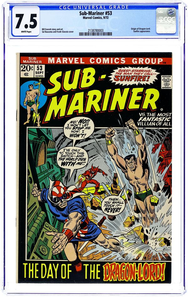 Ended Jul 1 2025 Winning Bid $27 Cover pencils by Sal Buscema, inks by Frank Giacoia. "And the Rising Sun Shall Fall!", script and art by Bill Everett; Namor convinces Sunfire to help him repair the freighter and contain the leak of defoliating agents that have spread into the sea; Meanwhile, the Dragon-Lord recalls his origin and how he came to create his base of operations using abandoned World War II technology; Sunfire and Namor then turn their attention to the Dragon-Lord and hope to prevent him from unleashing his plan for Armageddon. Golden age reprint from Sub-Mariner Comics (Marvel, 1954 series) #41, "The Return of the Nautilus!", script and art by Bill Everett; An art museum has just discovered that an expensive painting of the Nautilus from the story "20 Thousand Leagues Under the Sea" had been stolen and that the thief left a note proclaiming that as a master of the occult he will bring the Nautilus to life; When the story hits the newspaper, it is read by Betty Dean, who dismisses it as quackery just like the authorities; she relates the story to her friend, the Sub-Mariner. 36 pgs., full color. $0.20. Cover price $0.20. Grade: CGC 7.5 explanation of grade Condition: Used (collectible)
