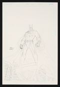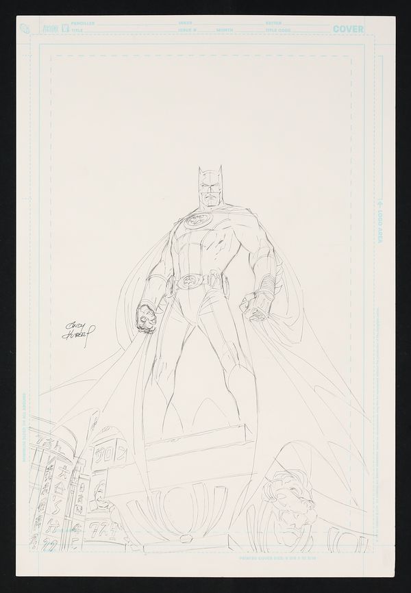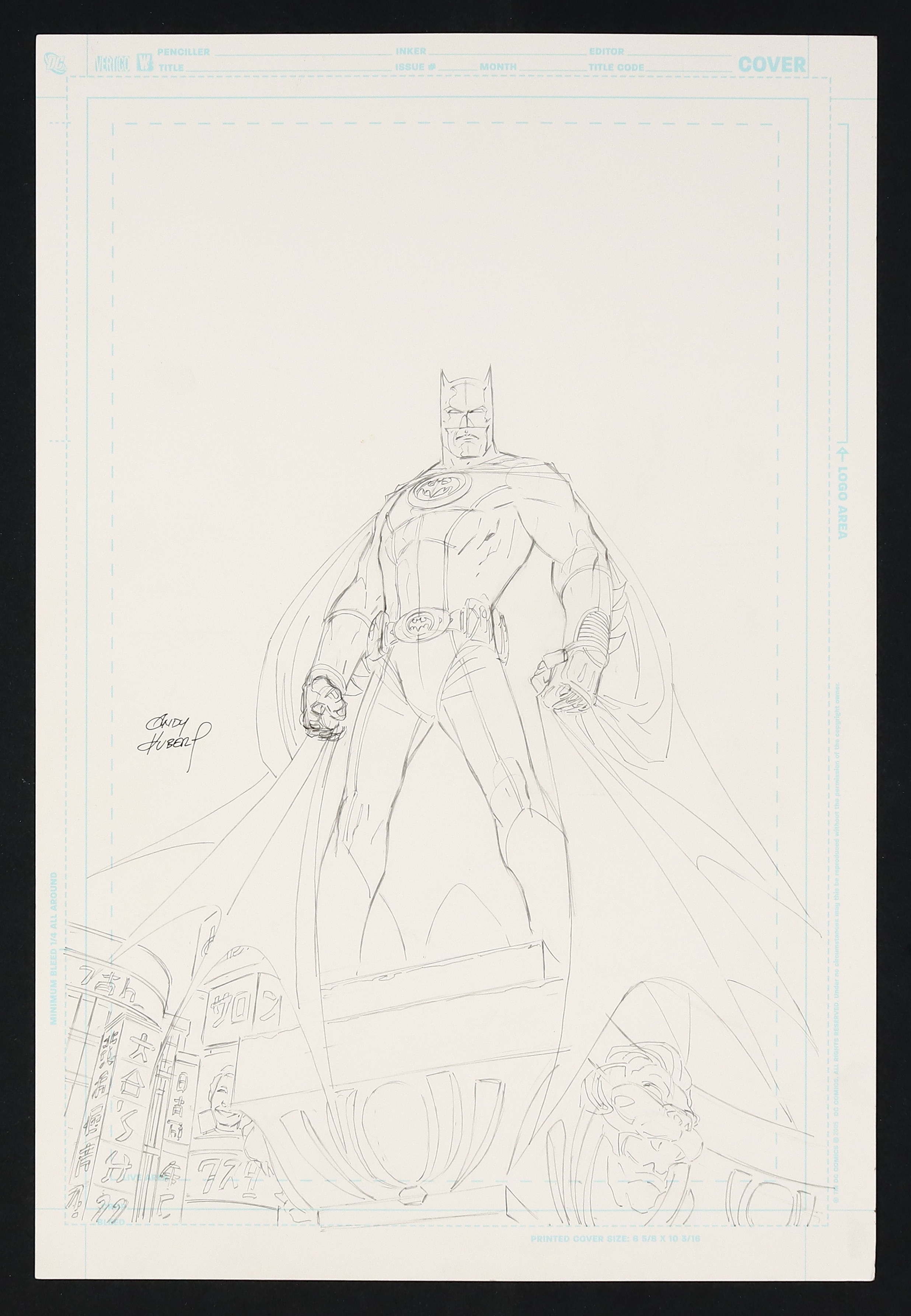 A prelim for a piece originally intended to be a variant cover for the first issue of Grant Morrison and Yannick Paquette's Batman Incorporated #1 in 2010, the final version was eventually released as a limited run print sold at conventions. The finished version of the piece can be seen here. In addition to Kubert's iconic and instantly recognizable rendition of the Dark Knight, we also see the beginnings of the magnificent background Kubert would add- a dizzying mishmash of international architecture and design tying in with Batman's new worldwide scope! Signed by the artist. Pencil on DC Comics art board. 11 1/2" x 17".