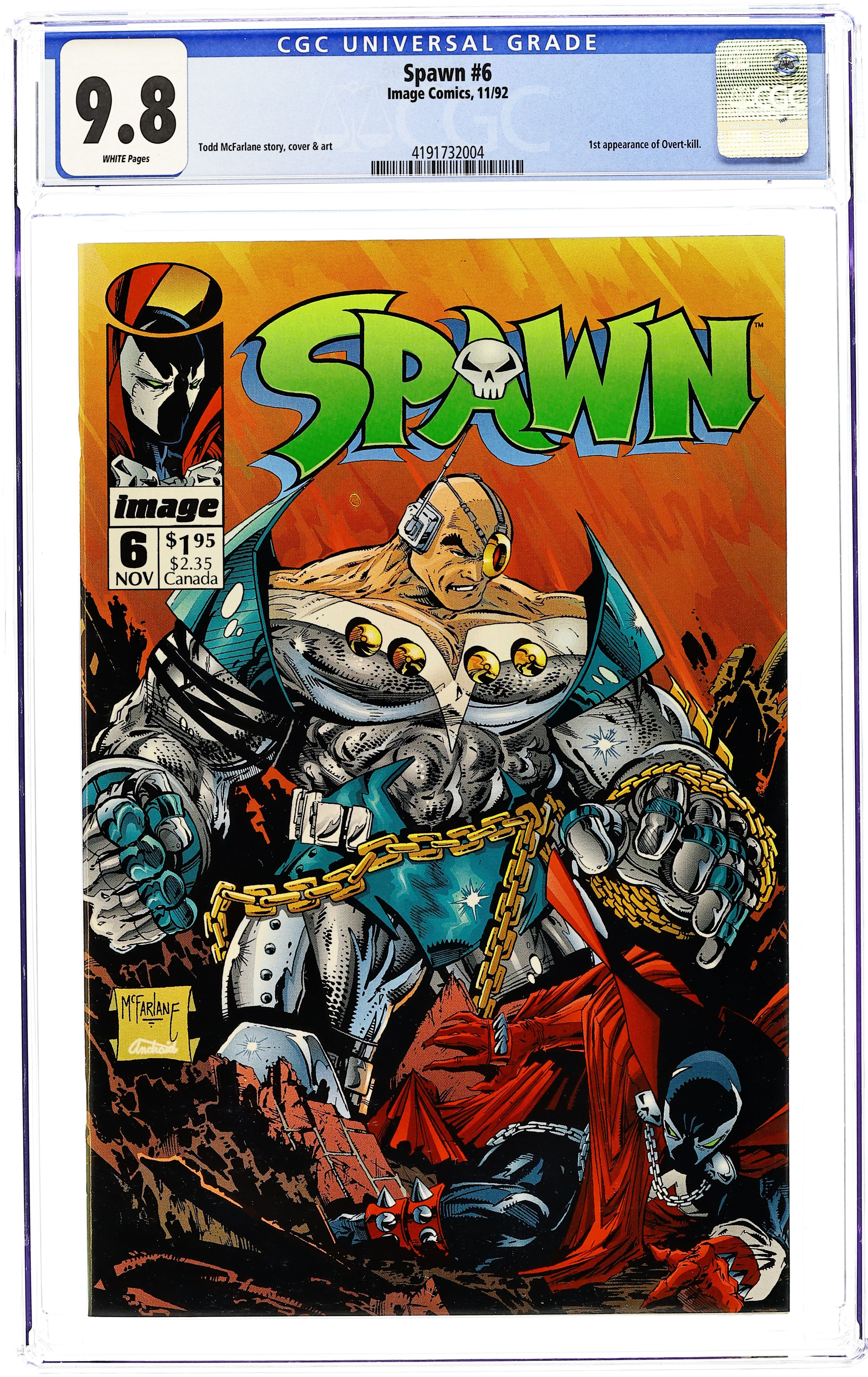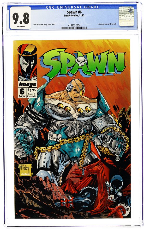 "Payback!" Part 1 of 2. 1st appearance of Overtkill. Created, story, and art by Todd McFarlane. Mafioso boss, Tony Twist, blames the new shadowy hero, Spawn, for the resent attacks on his men. Twist wants Spawn dead. Twist is a man who is used to getting what he wants. Enter: Overtkill, a cyborg killing machine who never fails. NOTE: Overtkill was created on an art training video featuring Stan Lee, Todd McFarlane, and Rob Liefeld. When Lee came up with the name "Overkill," Liefeld and McFarlane, using only the name, and within a matter of minutes, came up with the basic design for the character that would soon be known as Overtkill, a major villain in the Image Universe. - Odinson, Lone Star Comics Archivist Cover price $1.95. Grade: CGC 9.8 explanation of grade Condition: Used (collectible)