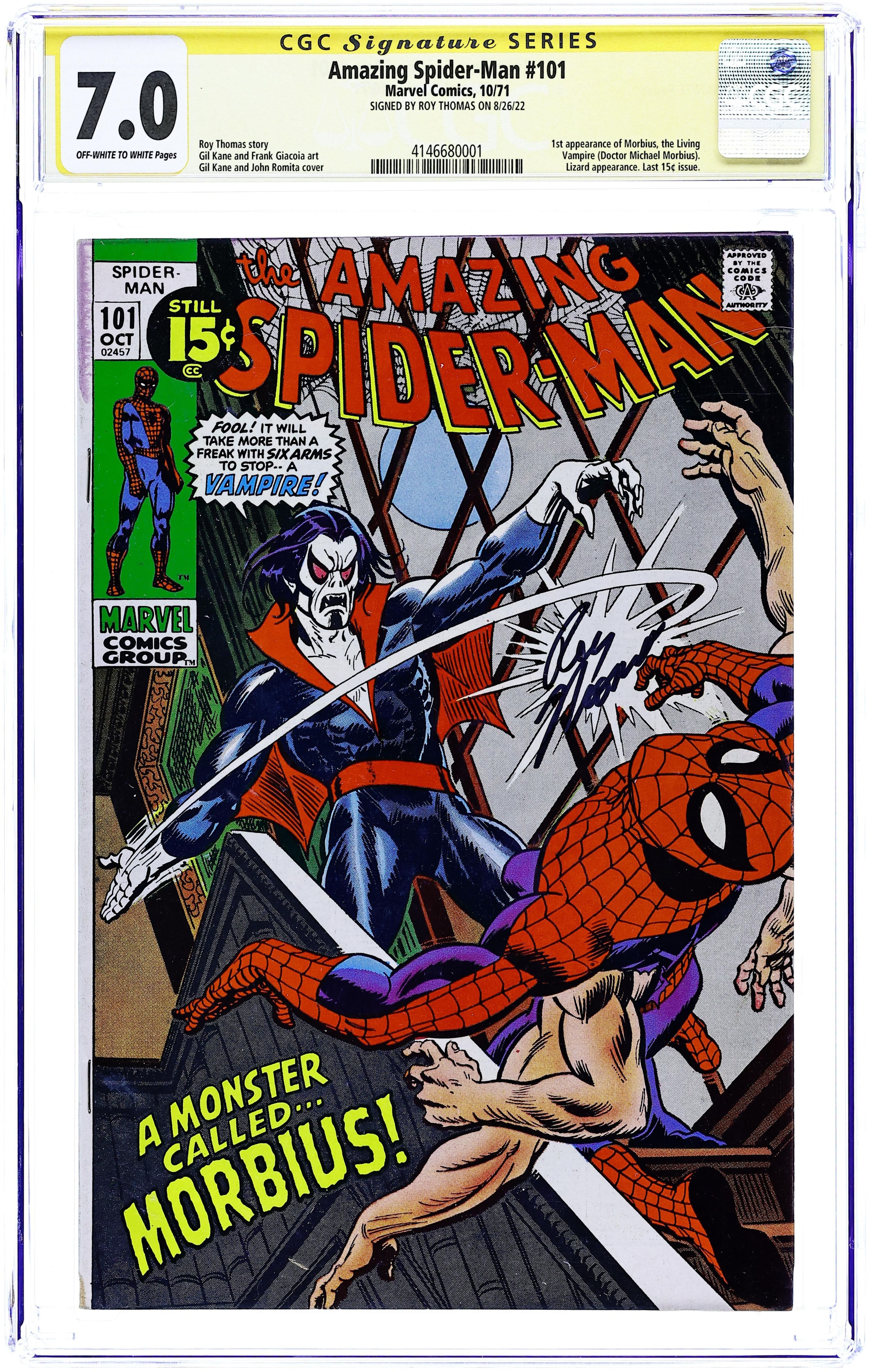 Ended Jul 28 2025 Bid History 23 bids Winning Bid $375 First appearance of Morbius the Living Vampire in "A Monster Called Morbius!" Script by Roy Thomas. Pencils by Gil Kane. Inks by Frank Giacoia. Cover by Gil Kane and John Romita. The first 100 issues of the Amazing Spider-Man title are in the books! And the next chapter in the web-slinger's anthology kicks off with the debut of Marvel's first bronze age vampire: Morbius! However, at the moment Peter Parker has a much bigger problem on his (six) hands. After drinking the special potion he developed, Aunt May's nephew grew four additional arms! Oh, my goodness! Peter is desperate to find a way to remove the arms, so he calls Dr. Curt Connors for help. Dr. Connors has a summer house and laboratory in Southampton on Long Island...and he gives Spider-Man permission to stay there and work on a cure. Meanwhile, a strange, pale, and bloodthirsty man is the sole survivor of a shipwreck near Southampton. And he's looking for a quiet place to rest. Oh no. Is the six-armed Spider-Man on a collision course with a living vampire? Oh yes! Cameo appearances by Gwen Stacy, J. Jonah Jameson, Joe Robertson, and the Lizard. Last 15ยข cover price. (Notes: This is the first issue of the Amazing Spider-Man series not written by Stan Lee. There exists a second printing of this issue published in 1992 with a silver background cover. Marvel also published a facsimile edition of Amazing Spider-Man 101 in 2021.) 36 pages. Cover price $0.15. Grade: CGC 7.0 explanation of grade Condition: Used (collectible)