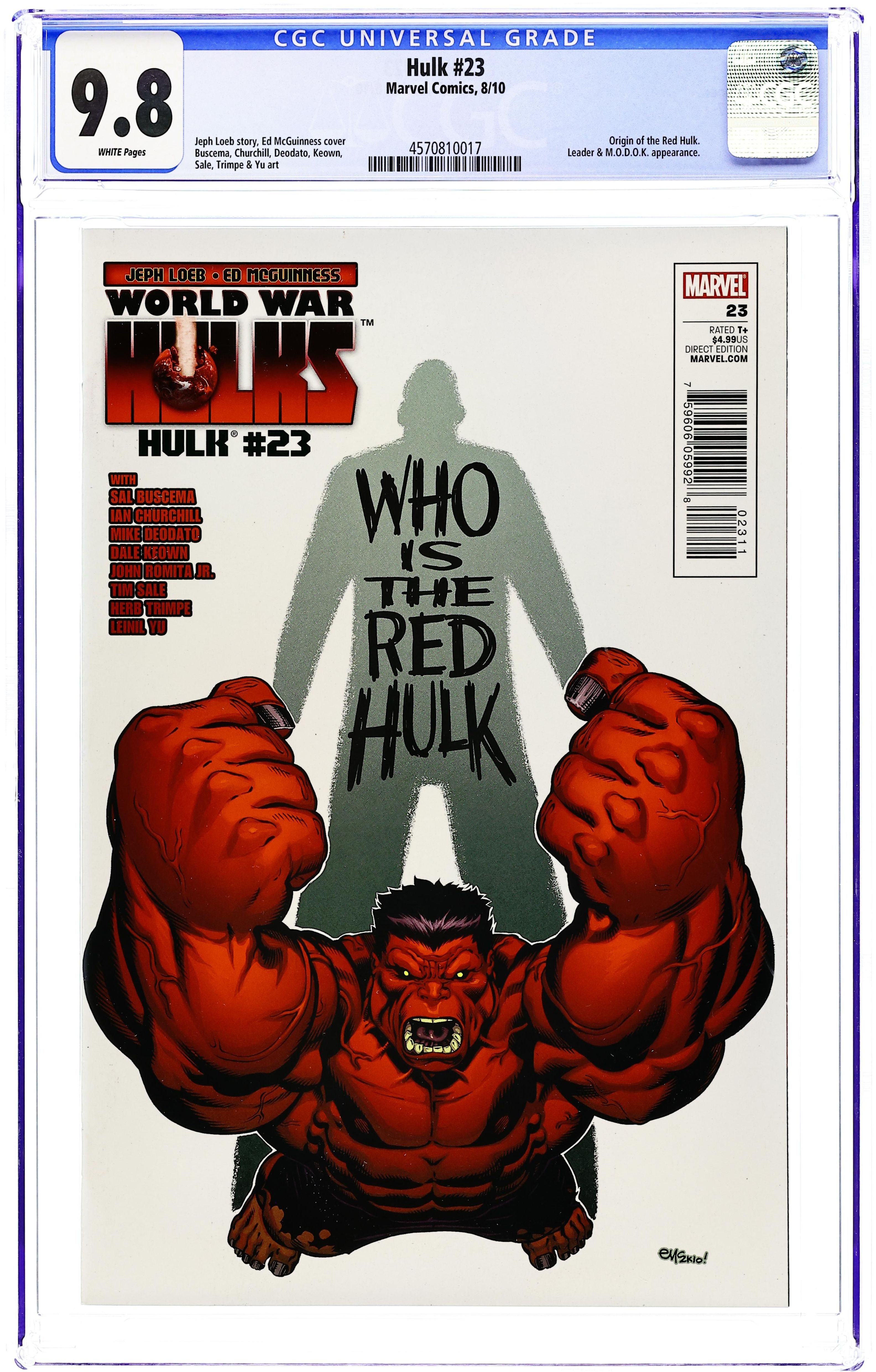 Ended Jul 17 2025 Bid History 11 bids Winning Bid $34 Cover by ED MCGUINNESS. Written by JEPH LOEB. Art by ED McGUINNESS & MARK FARMER, with HERB TRIMPE (1 page), TIM SALE (3 pages), DALE KEOWN (2 pages), SAL BUSCEMA (3 pages), IAN CHURCHILL (4 pages), LEINIL YU & GERRY ALANGUILAN (4 pages), JOHN ROMITA, JR. & KLAUS JANSON (3 pages) and MIKE DEODATO (4 pages). WORLD WAR HULKS RAGES ON! Not a dream. Not a hoax. THE ORIGIN OF THE RED HULK. 'Nuff Said. 48 PGS Cover price $4.99. Grade: CGC 9.8 explanation of grade Condition: Used (collectible)