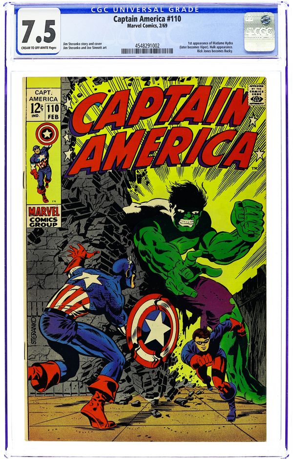Ended Oct 14 2025 Bid History 21 bids Winning Bid $195 Cover by Jim Steranko. Rick Jones becomes Cap's partner in "No Longer Alone!", script by Jim Steranko (plot) and Stan Lee (dialogue), pencils by Jim Steranko, inks by Joe Sinnott; Cap runs across the Hulk on a rampage in NYC; The Hulk escapes and Cap vows Rick must never put himself in danger until the monster can be tamed. Back at Avengers Mansion Rick finds Bucky Barnes' old uniform, and rejects Cap's protests against wearing it; After putting him off for years, Cap finally accepts Rick officially as his new partner; Almost immediately they uncover a plot by HYDRA to contaminate the city's water supply. After a series of battles the HYDRA goons are driven off, and Cap tells Rick he survived his "baptism of fire" like a man. 36 pgs., full color. NOTE: 1st appearance of Madame Hydra Cover price $0.12. Grade: CGC 7.5 explanation of grade Condition: Used (collectible)