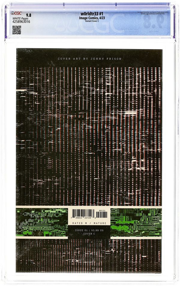 Ended Jul 18 2025 Bid History 12 bids Winning Bid $37 Limited 1 for 10 Retailer Incentive Variant Cover. Written by James TynionIV. Art by Fernando Blanco, Jordie Bellaire. Cover by Jenny Frison. In 1999, Gabriel and his friends discovered the Undernet, a secret architecture to the Internet. They charted their exploration on a message board called W0RLDTR33. Then they lost control. Someone broke into W0RLDTR33-someone who welcomed the violent hold the Undernet had on them. At great personal cost, Gabriel and the others thought they sealed the Undernet away for good. They were wrong. And now they will know the meaning of PH34R. The next major horror outing from multiple Eisner Award-winning writer JAMES TYNION IV (THE DEPARTMENT OF TRUTH, The Nice House on the Lake) and FERNANDO BLANCO (Detective Comics), along with Eisner-winning colorist JORDIE BELLAIRE and Eisner-nominated letterer ADITYA BIDIKAR, begins here! 32 pages, full color. Rated M Cover price $3.99. Grade: CGC 9.8 explanation of grade Condition: Used (collectible)