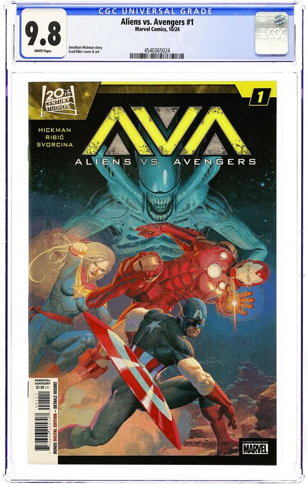 Written by Jonathan Hickman. Art by Esad Ribic. Cover by Esad Ribic. ALIENS AND AVENGERS FACE OFF! It's all led to this: Xenomorphs reach Earth! The perfect organism meets a planet of superhumans. Who will be first to fall? Legendary collaborators Jonathan Hickman and Esad Ribić cut loose in this four-part epic unmissable for Marvel and Alien fans alike! 48 pages, full color. Rated Parental Advisory Cover price $7.99. Grade: CGC 9.8 explanation of grade Condition: Used (collectible)
