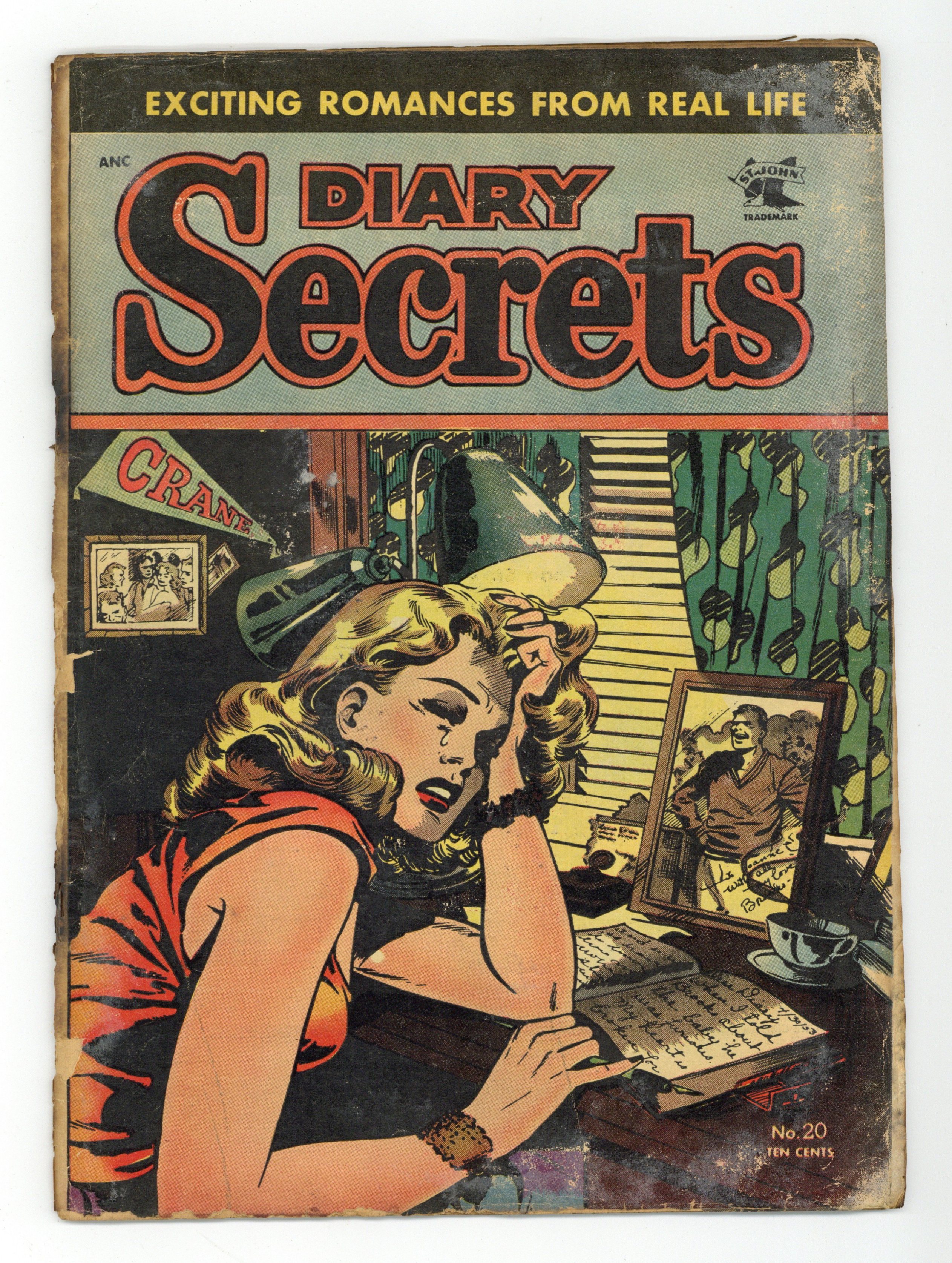 Cover by Matt Baker. Stories and art by Joe Kubert, Warren King, John Giunta, Robert Bernstein and Max Elkan. Early romance comics from St. John with an emphasis on scandal and great covers by Matt Baker. Jan sets her sights on co-worker Elmer, but he's smitten with Eve, who already has a boyfriend. Silver-screen villain Jon is famous for his "ugly" face, but fellow actor Gina loves him for the man inside, even after a fire disfigures him further. Susan smells trouble when her brother Carl starts dating Georgia, but she has no idea how much trouble is actually coming. Plus a story with early art by comics legend Joe Kubert. Matt Baker outdoes himself with this cover. Ring Around My Heart; My Stand-in for Love; Comedy Column; Gag-Bag; The Face of an Angel; My Boomerang Lies. 32 pages, Full Color. Cover price $0.10. Grade: PR 0.5 explanation of grade Condition: Used (collectible)
