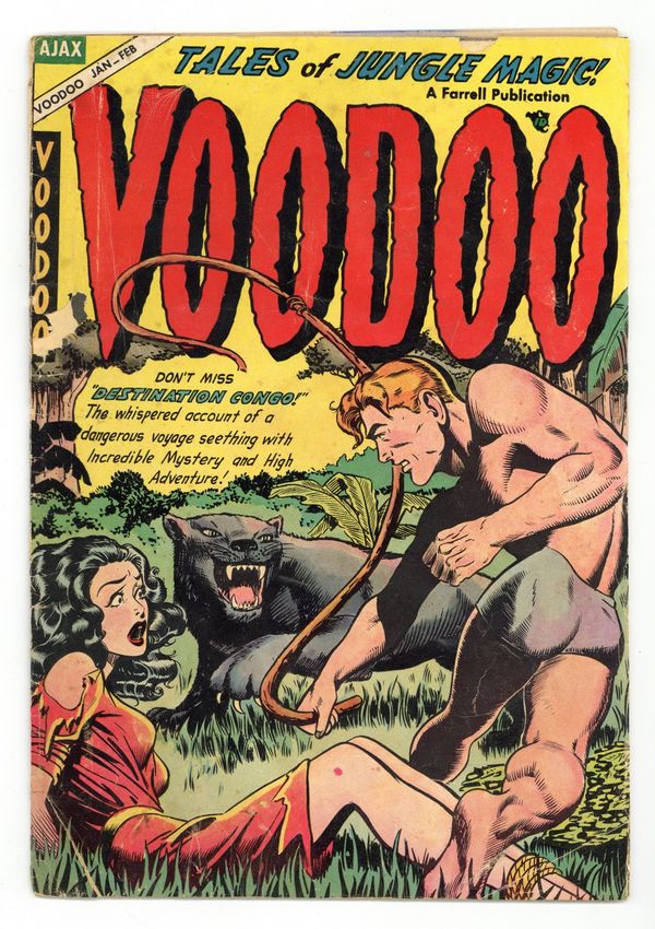 Ajax-Farrell's horror series Voodoo managed to stand out in the crowded field of pre-Code horror comics by dint of its sheer weirdness. A jungle queen battles strange foes, in a story with art by good-girl legend Matt Baker. A female reporter and a hotshot pilot struggle to survive in the Arctic after a crash landing. A jungle hero battles pirates who have escaped from a jungle prison. Destination Congo; Arctic Crash; Haunted Ink!; The Legend; The Thirsty Blade. Final issue under this title; the series continues as Vooda (1955) #20. 36 pages, Full Color. Cover price $0.10. Grade: GD- 1.8 explanation of grade Condition: Used (collectible)