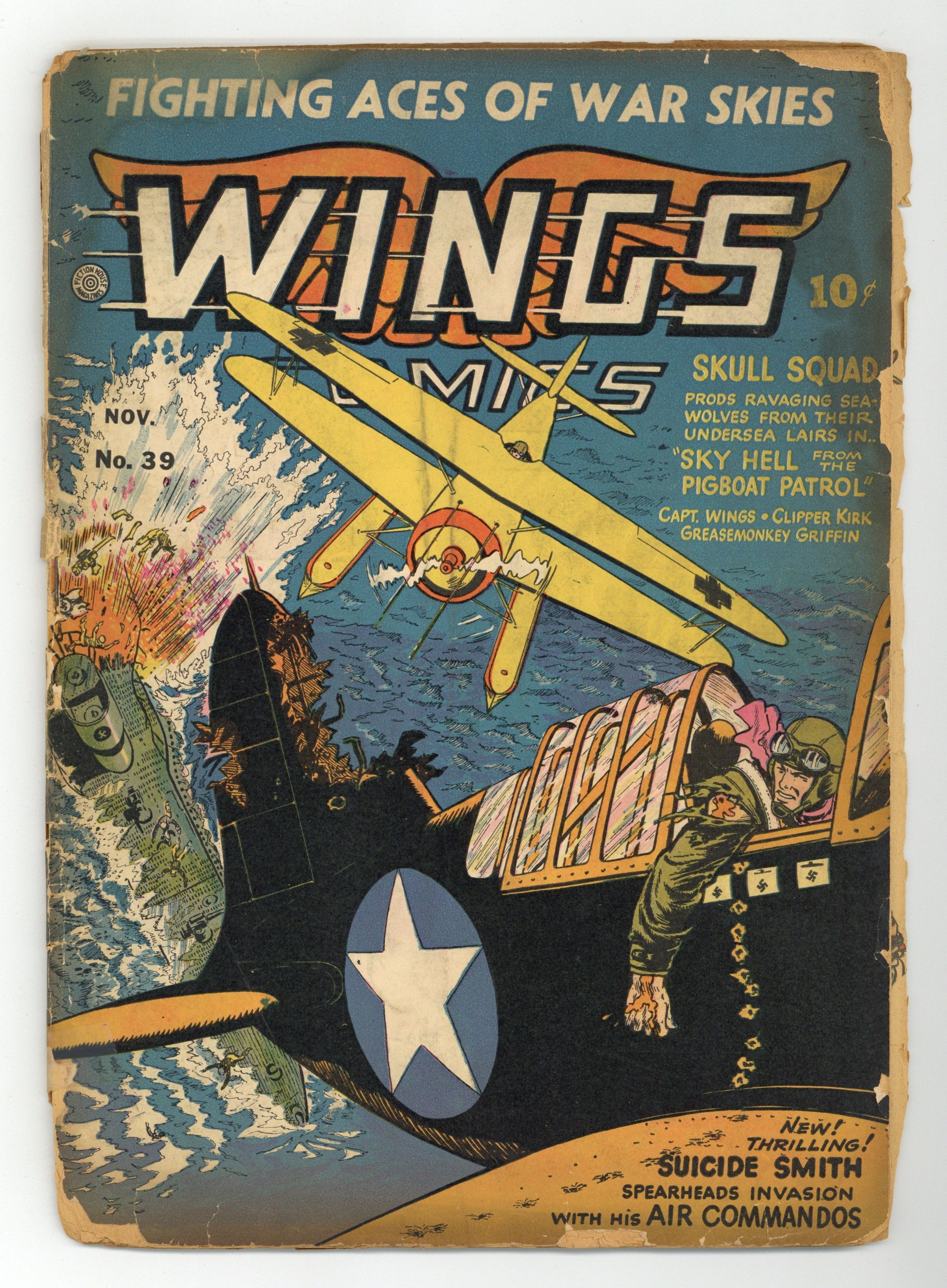 Cover by Art Saaf. Edited by Malcolm Reiss. Stories and art by George Appel, Joe Doolin, Lily Renee, Karen Karol, Ruben Moreira, and Ruth Atkinson. Aviation-themed adventure, combat and history tales from pioneering comics publisher Fiction House. More nice Lily Renee good-girl art as Agent Jane Martin finds a lost Shangri-La in Tibet; The story of a tail-gunner's anonymous sacrifice; Greasemonkey Griffin gets involved with a captured German general who has secret documents. Also featuring model airplane tips and aircraft drawings submitted by readers. Skull Squad; Jane Martin; Clipper Kirk; Captain Wings; Suicide Smith; Wing Tips; Bobtail Ace; Wildcat Vengeance; Yank Aces of World War II; Greasemonkey Griffin. 60 pages, Full Color. Cover price $0.10. Grade: PR 0.5 explanation of grade Condition: Used (collectible)