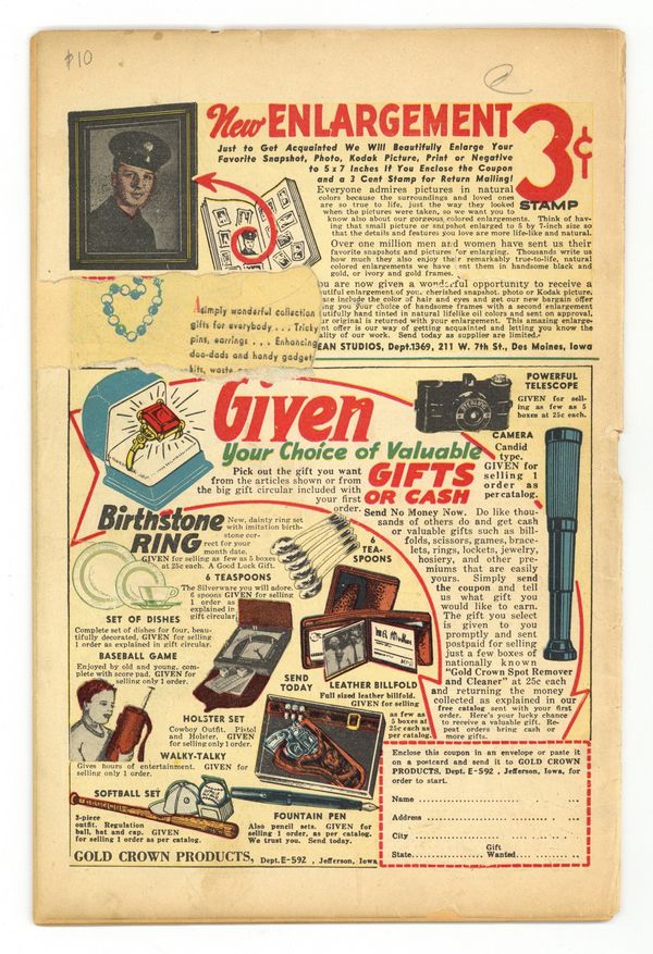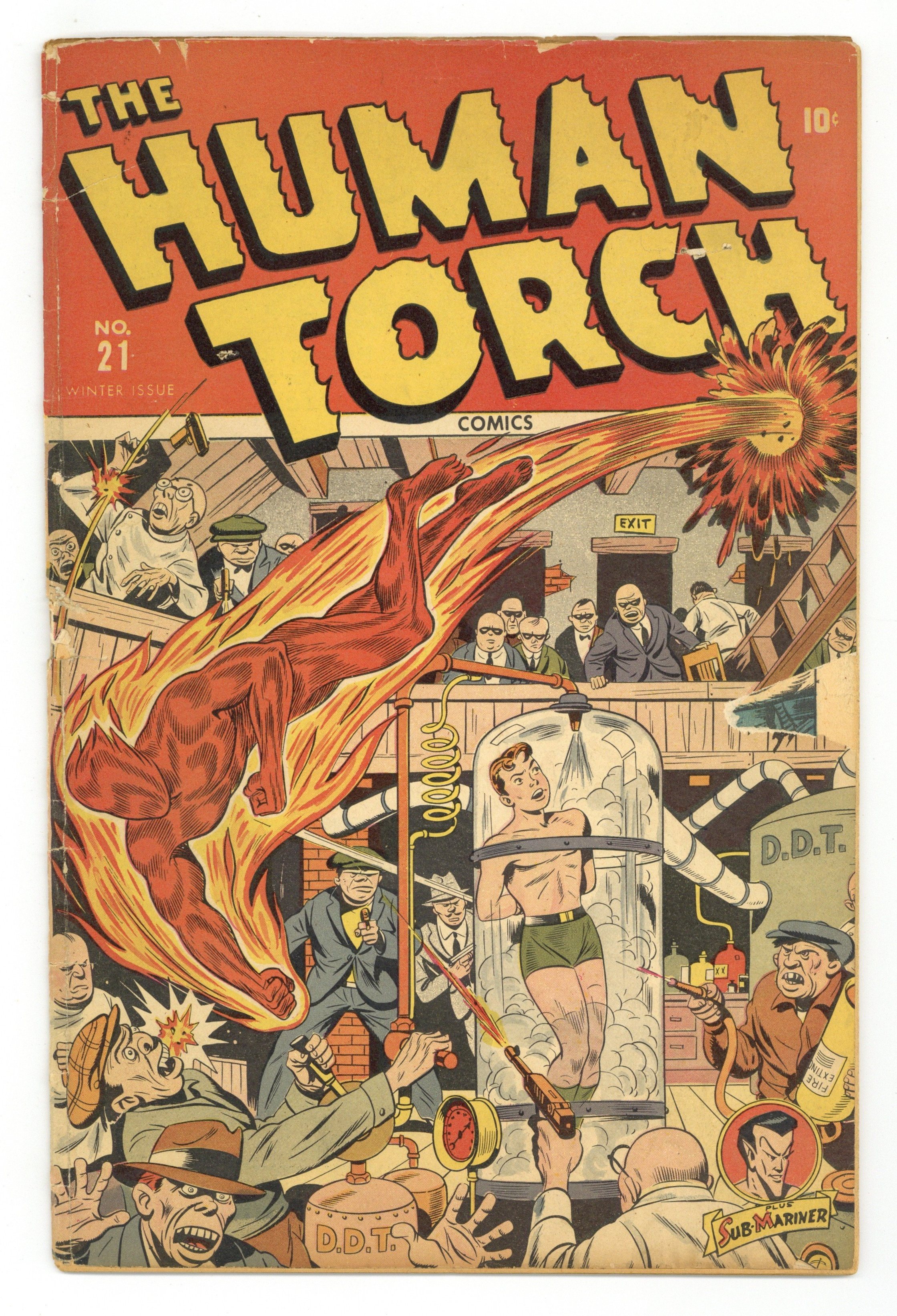 Cover art by Alex Schomburg. Death Writes a Diary starring the Human Torch; A villain named Snowball gets the hotseat for murders committed because he likes cold and hates heat. The House That Changed Color starring the Human Torch. An Eye For an Eye text story. Murder In Blackout starring the Sub-Mariner. $0.10. Cover price $0.10. Grade: FR 1.0 explanation of grade Condition: Used (collectible)