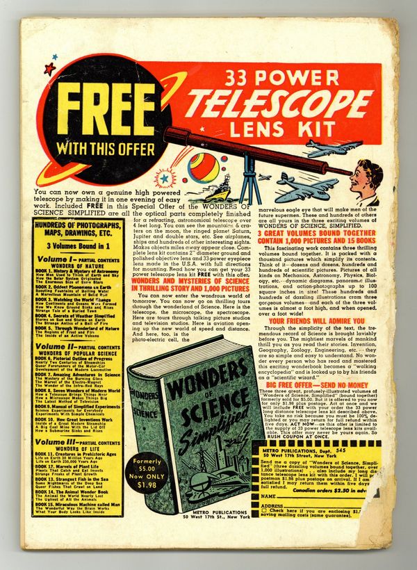 Cover by C. C. Beck. Stories and art by C. C. Beck, Lynn Perkins, Tom McNamara and Phil Bard. Fawcett's first squarebound comic is an anthology of its greatest superheroes, including Bulletman, Spy Smasher, and of course the original Captain Marvel (Shazam). Inventor Chauncey Kiddin shows Captain Marvel the wonders of the future, including 3-D TV, but his assistant Dr. Ratte wants to use his teleporter to aid a Nazi invasion. Minute Man becomes a momentary Monument Man while retrieving art treasures that were stolen by the Nazis. Commando Yank must escape from occupied Holland with Nazi defense plans hidden inside a pipe, and stop a dike demolition in the process. Plus a PSA for war bonds and stamps featuring the Marvel family, Bulletman, Spy Smasher and Captain Midnight. And a magic trick from Balbo the Boy Magician. Captain Marvel: The World of Your Tomorrow!; Commando Yank: Danger at the Dike; Off the Beam; Bum Ticker; Bulletman: The Killer-Diller Killers; The Camera Sees Death; Minute Man in Berlin; Balbo the Boy Magician: The Missing Rabbit; Balbo's Own Magic Pages; Herbert; Spy Smasher; Mr. Scarlet and Pinky: The Riddle of the Runaway Room. 96 pages, Full Color. Cover price $0.15. Grade: FR 1.0 explanation of grade Condition: Used (collectible)