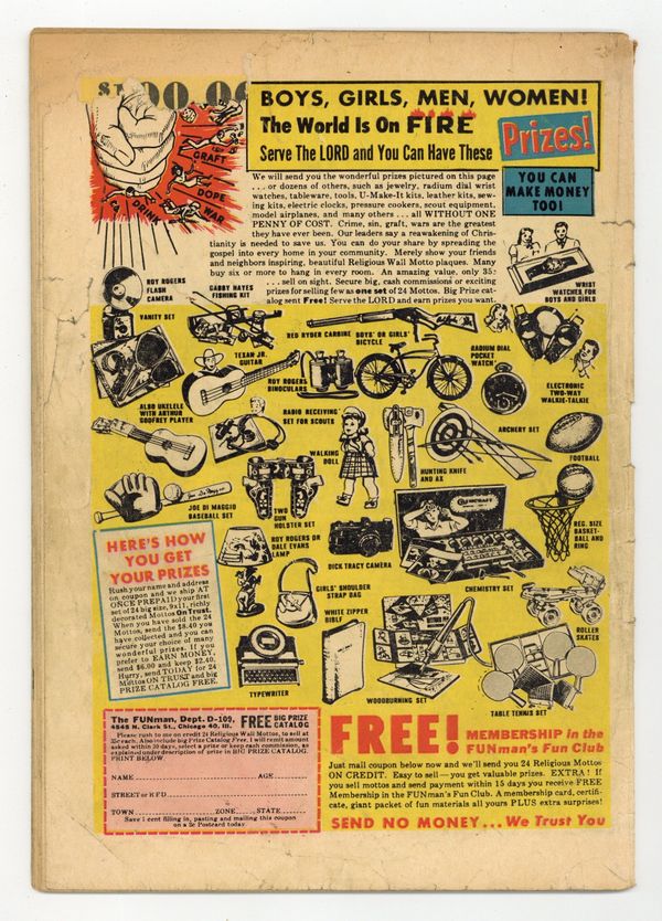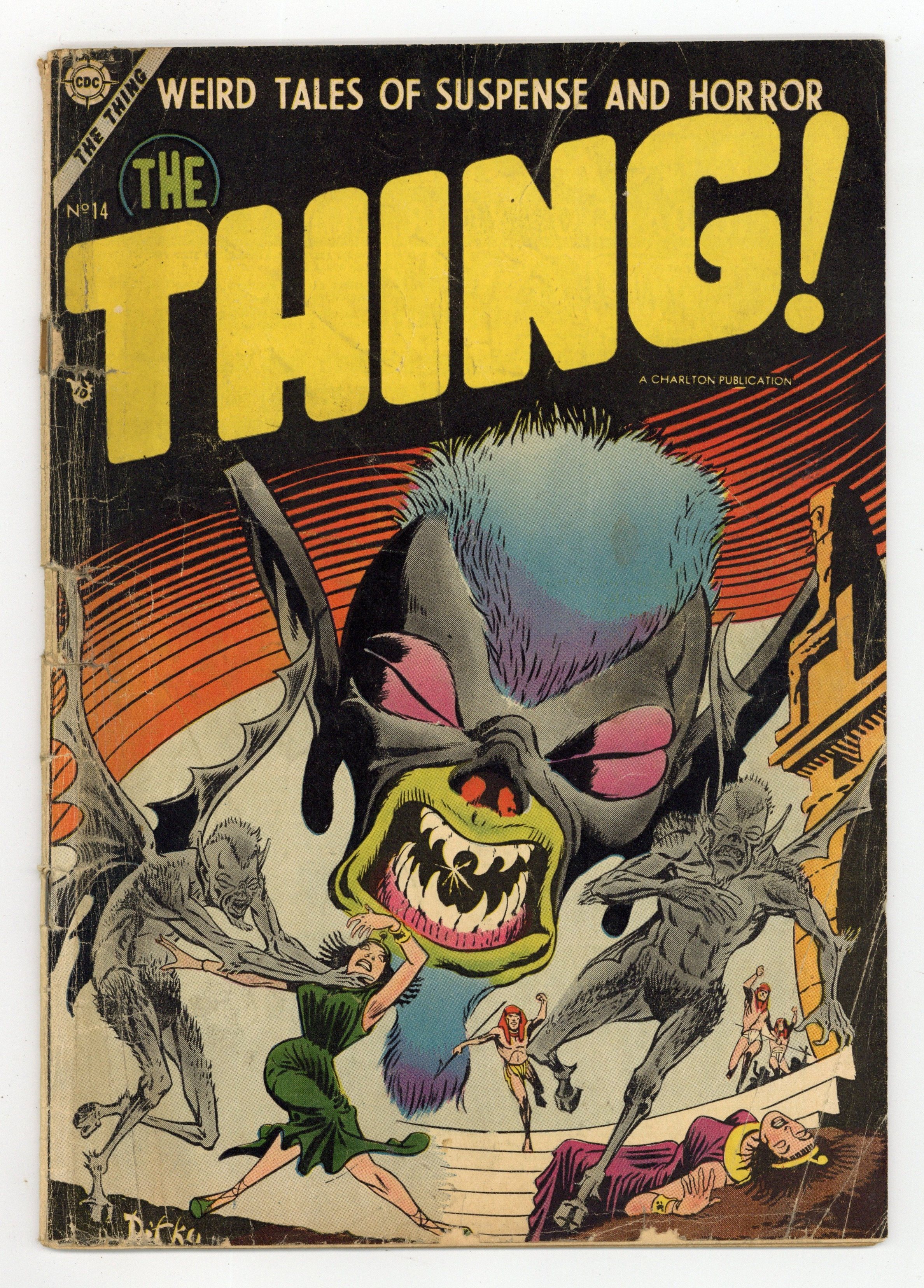 Cover by Steve Ditko. "Rumpelstiltskin," art by Steve Ditko; The demon Rumpelstiltskin wants to get his hands on soft, human skin. "The Evil Eye!", script by Carl Memling, art by Steve Ditko; Warren Cairo plans on murdering his wife Gerda; But she's a witch and knows how to handle the imminent danger. "Mr. Kon Shuns" text story. "Doom in the Air," script by Carl Memling, art by Steve Ditko; Wes Brewster is lynched by the Jones brothers; Years later he is awakened by an atom bomb test, stalking his wrongdoers and leaving a trail of radiation poisoning behind him. "Inheritance!", art by Steve Ditko; archeologists Carl Ramen and John Marko discover an Egyptian tablet describing an age-old curse concerning themselves. 36 pgs., full color. $0.10. Cover price $0.10. Grade: GD- 1.8 explanation of grade Condition: Used (collectible)