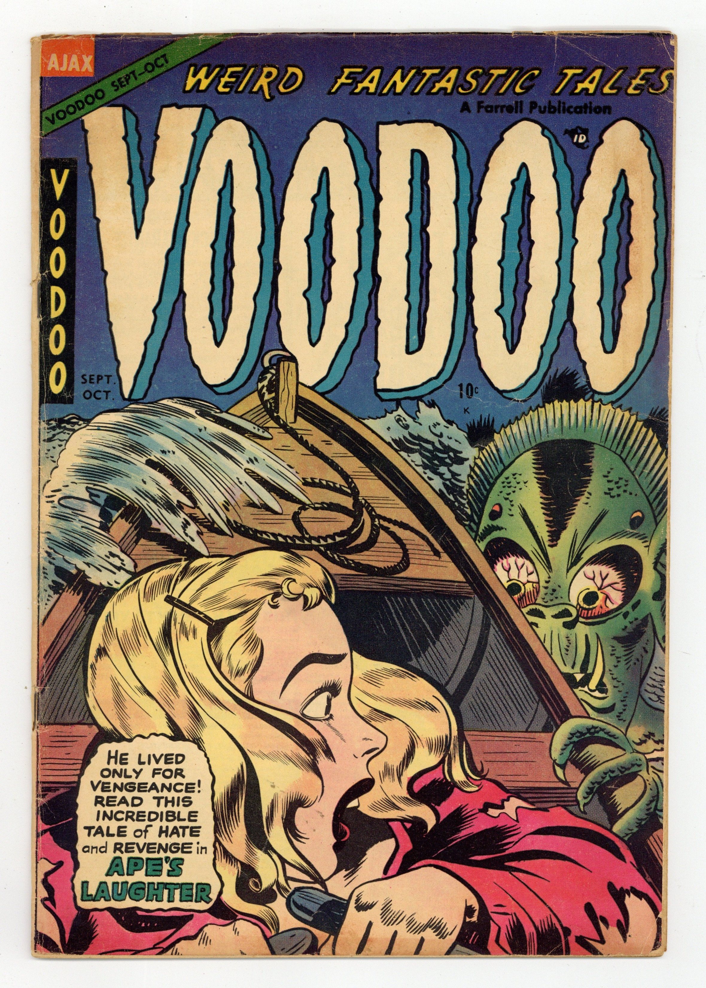 Ajax-Farrell's horror series Voodoo managed to stand out in the crowded field of pre-Code horror comics by dint of its sheer weirdness. A voodoo mage offers to bring a doctor's wife back to life...for a price. A British soldier returns to the Irish lands where his ancestor ordered a massacre, and learns the horrifying secret of the bog people. A man visiting India becomes caught up in the Thuggee murder cult. Forever Dead; Creatures from the Deep; The Dreadful Vision; Ape's Laughter; Cult of the Cruel. 36 pages, Full Color. Cover price $0.10. Grade: VG- 3.5 explanation of grade Condition: Used (collectible)