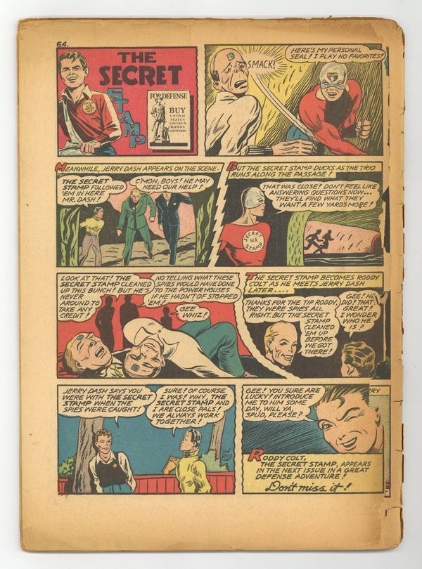 Ended Oct 13 2025 Bid History 15 bids Winning Bid $174 Cover art by Al Avison and Chad Grothkopf (Imp inset). "The Horde of the Vulture!", art by Al Avison; Steve Rogers and Bucky Barnes head out to Camp Mojave in the American Southwest where their convoy is hijacked by an American traitor who calls himself the Vulture, who is in charge of a group of Indians working for the Japanese. Captain America Brain Teasers activity page. The Young Allies ad. "The Petals of Doom!", art by Avison; Cap and Bucky must save Betty from the fate inflicted on top military officers: death from the aroma of flowers. Untitled The Imp story, script by Stan Lee, art by Chad Grothkopf; Cap and Bucky must save Betty from the fate inflicted on top military officers: death from the aroma of flowers. "The Commandos" text story. Untitled Elmer story, pencils by Mike Sekowsky, inks by George Klein; In a series of three non-related one page strips, Elmer learns the hard way that trying to do the right thing often leads to bad results. Untitled The Secret Stamp story, script by Stan Lee, art by Don Rico; While Roddy and Spud engage in a contest to see who can sell the most defense stamps, Roddy runs into three Nazis who aim to create a panic by crippling the city's electric, gas and water supply stations. Sentinels of Liberty Secret Club News. 68 pgs., full color. Cover price $0.10. Cover price $0.10. Grade: Coverless explanation of grade Condition: Used (collectible)