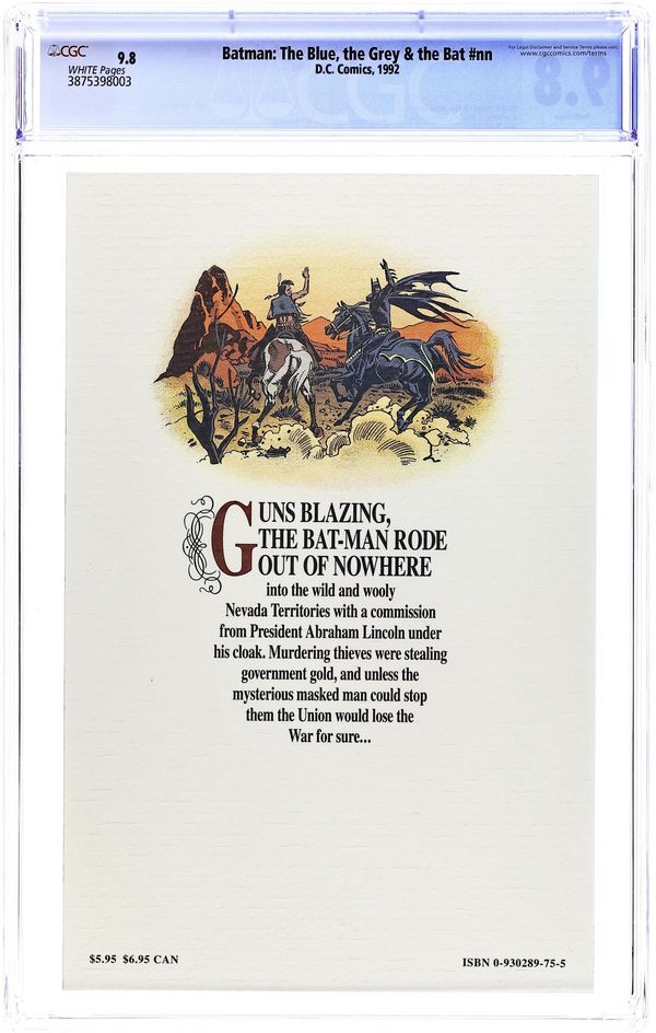 Ended Jul 17 2025 Bid History 9 bids Winning Bid $26 "This is the story of how Abraham Lincoln sent a Bat-Man to secure the greatest source of wealth in a generation for the forces of the Union...and how, at the height of the most critical upheaval in America's history, a new state rose from the wilderness..." BATMAN: THE BLUE, THE GREY AND THE BAT is an Elseworlds tale in the historic tradition of BATMAN: GOTHAM BY GASLIGHT and BATMAN: MASTER OF THE FUTURE. This time, Batman is in the American West during the Civil War on a dangerous secret mission for President Lincoln. As he relentlessly pursues a threat to the Union, Batman, and his alter ego Bruce Wayne, encounter Samuel Clemens, Wild Bill Hickok and other luminaries of the Old West. His servant and friend, the ever-droll Alfred, makes his contribution to the action, as does the Bat-Man's Native American partner, Redbird. Written by Elliot S. Maggin, with art and cover by Alan Weiss and Jose Luis Garcia-Lopez. 68 pages. Prestige Format. The cover is on special ivory matte-textured stock, evoking the feeling of the Old West. Cover price $5.95. Grade: CGC 9.8 explanation of grade Condition: Used (collectible)
