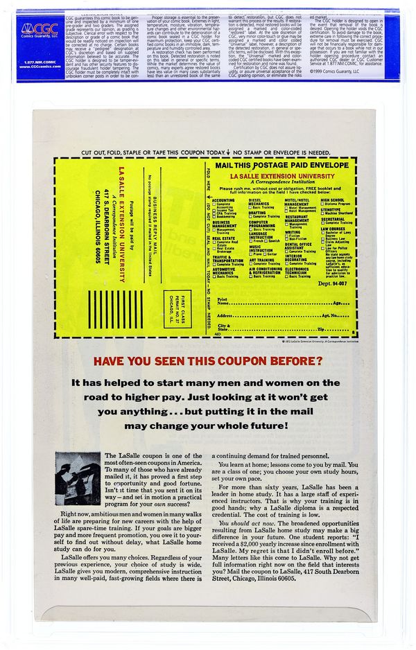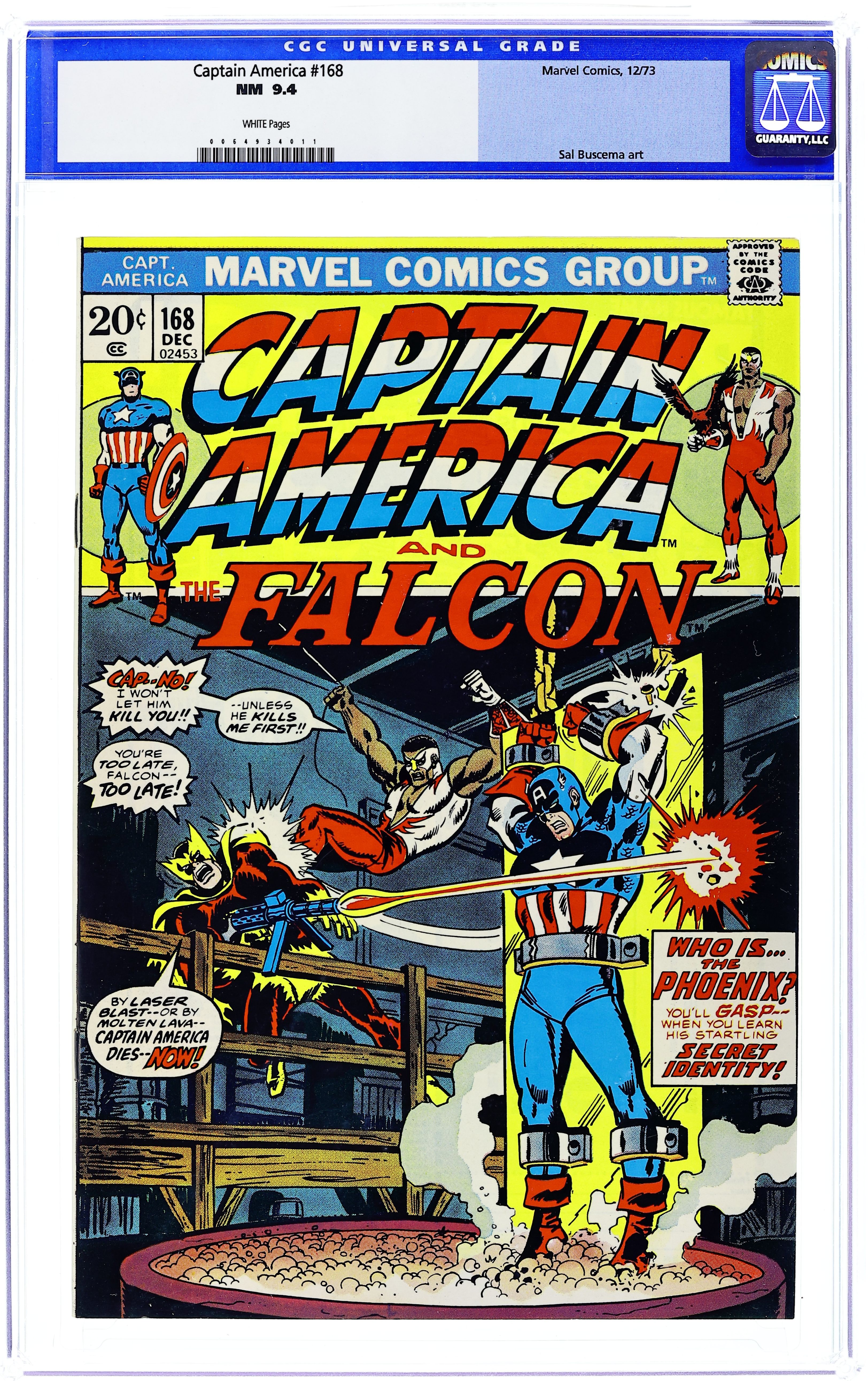 First appearance of Helmut Zemo in "And a Phoenix Shall Arise!" Script by Roy Thomas and Tony Isabella. Pencils by Sal Buscema. Inks by John Tartaglione and George Roussos. Cover by Sal Buscema and John Verpoorten. On a rooftop in Manhattan, a mysterious assailant ambushes the star-spangled avenger! Cap doesn't know who the surprise attacker is, but he calls himself the Phoenix. And he really seems to hate Captain America! The fight is short and inconclusive, so the next evening Cap patrols the same area...and runs into the Phoenix again! However this time the new villain wins! And as shown on the cover, the Living Legend soon finds himself dangling over a vat of Adhesive X. Hold on, Adhesive X was the calling card of the late Baron Heinrich Zemo. Is the past coming back to haunt the Sentinel of Liberty? Thankfully, the Falcon and Redwing make sure it's not today. But one of Cap's greatest foes -- and also one of the Avengers' -- is born! Flashback cameos by Baron Heinrich Zemo and the Red Skull. (Note: Helmut Zemo returns several years later in Captain America 275 and officially adopts the name and uniform of his father.) 36 pages. Cover price $0.20. Grade: CGC 9.4 explanation of grade Condition: Used (collectible)