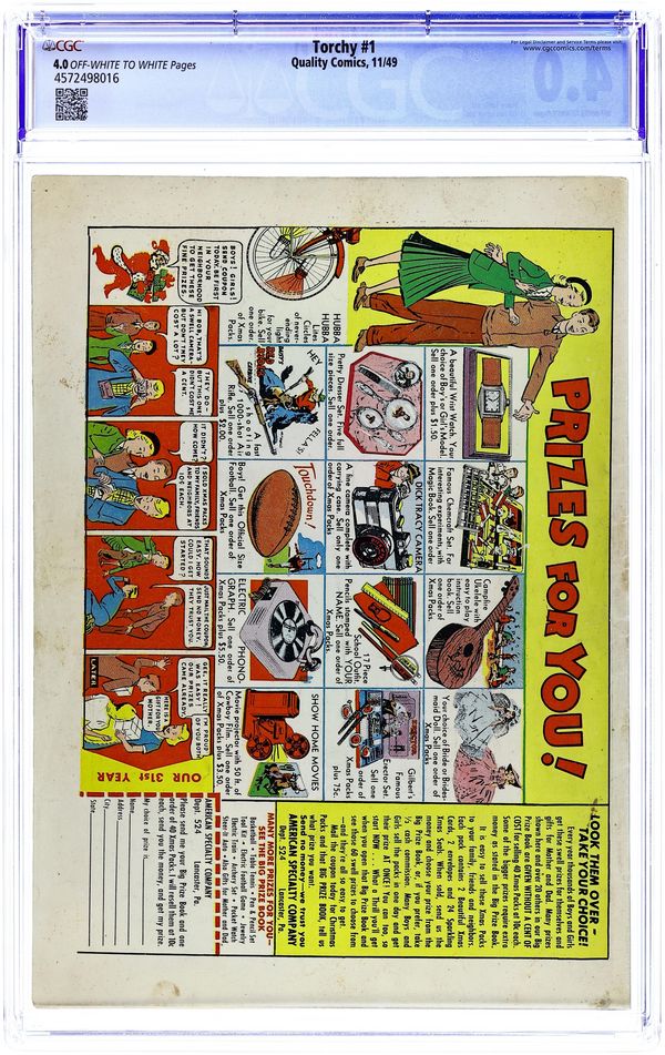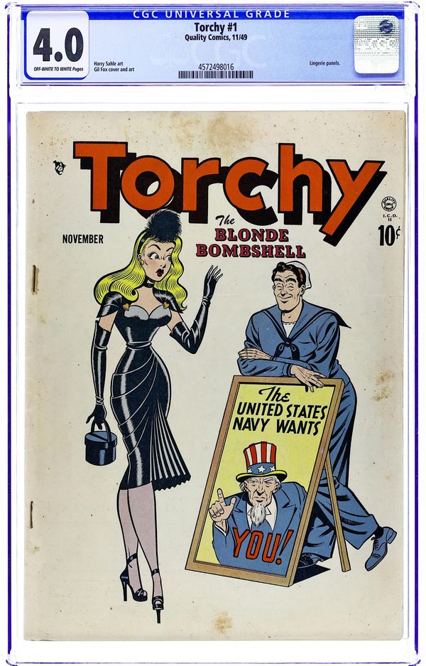 Ended Jul 14 2025 Bid History 14 bids Winning Bid $530 Cover art by Gill Fox. Untitled story; Ed takes Torchy and Tess to visit his inventor friend Elmo who has just developed a robot that answers voice commands; Unfortunately, the robot takes things a little bit too literally; Sam Brown tries to sell hatpins but almost gets engaged to a homely princess instead. Untitled story; Torchy gets on a radio quiz show. "Just Call Me Sugah" text story. Untitled story; Ed gets a job as a millionaire's chauffeur and tries to get money to back a show. 36 pgs., full color. Cover price $0.10. Grade: CGC 4.0 explanation of grade Condition: Used (collectible)
