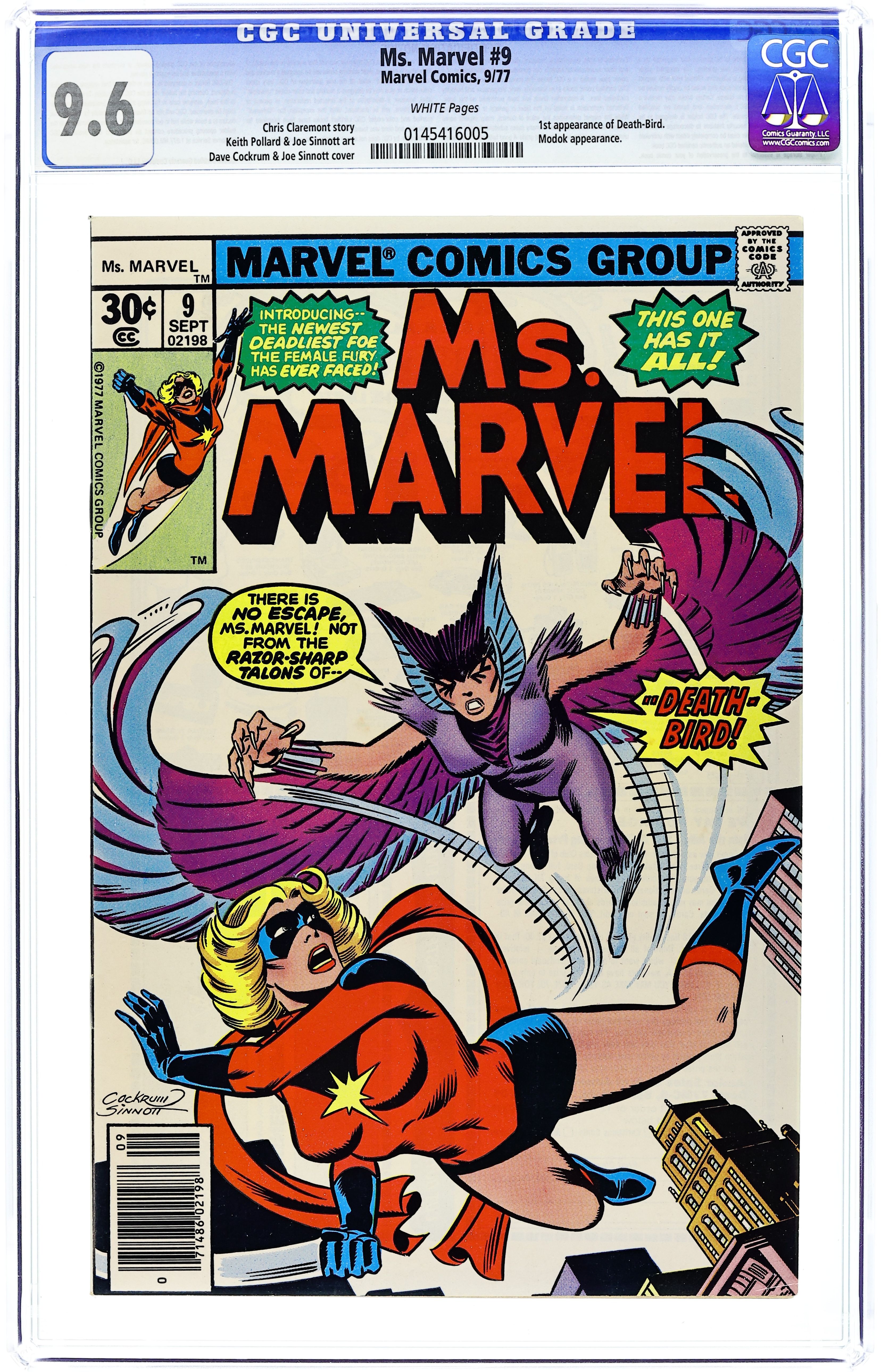 Cover pencils by Dave Cockrum, inks by Joe Sinnott. Call Me Death-Bird!, script by Chris Claremont, pencils by Keith Pollard (breakdowns), Joe Sinnot (finished art), and Sam Grainger (finished art), inks by Joe Sinnott (pages 1, 3-6, 11) and Sam Grainger (pages 2, 7-10, 14-31); Deathbird tries to take down Ms. Marvel on orders from Modok; 1st appearance of Death-Bird. Including Death-Bird, Chris Claremont introduced a few characters in this series that would later become popular X-Men mainstays. Ms. Marvel's costume covers her stomach now. 36 pgs. $0.30. Cover price $0.30. Grade: CGC 9.6 explanation of grade Condition: Used (collectible)