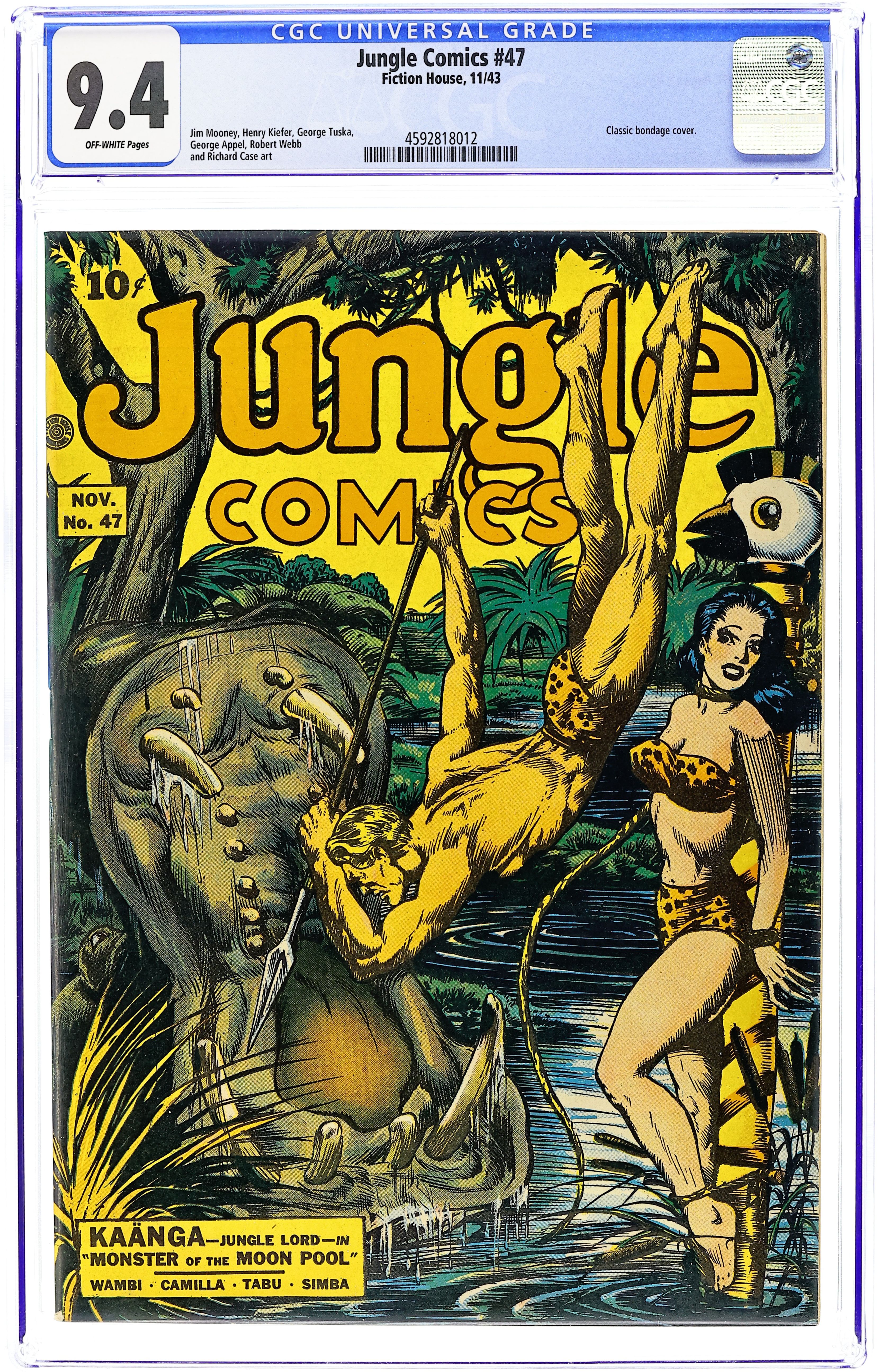 Cover art by Rafael Astarita. "Monster of the Moon Pool" starring KaƤnga, art by Jim Mooney; Muranda, a white woman, leads a tribe of natives in collecting very expensive cobra venom; Muranda, fearing interference in her business, captures Ann and attempts to execute her via hippopotamus. Untitled Simba story, art by Richard Case; A tiger is brought to Africa as part of an experiment to breed lion-tiger hybrids: tiglons; Oneof the tiglo cubs escapes and, when grown to adulthood, challenges Simba for the kingship of the jungle. Untitled story; Terry helps determine that the "ghost" haunting an Arab fortress is a hermit looking for treasure. Untitled story, art by Henry Kiefer; White hunters capture all of Wambi's jungle friends, save Bruno the bear; Wambi and Bruno rescue them by tricking the hunters into thinking that their partners are dishonest. Untitled story, art by George Appel; Fantomah and Horus investigate an oasis where travelers are being robbed. "Curse of the Juju Diamond" text story. Untitled story; A tribe, ruled by a white Snake Queen, robs prospectors of their gems until they rob a friend of Tabu's. "The Jungle Is Haunted!", art by George Tuska; A girl is sacrificed to a crocodile pool by a village; Later, her ghost begins to haunt them. Camilla determines that the girls was rescued by Blab, a man who lives with baboons. 60 pgs., full color. Cover price $0.10. Grade: CGC 9.4 explanation of grade Condition: Used (collectible)