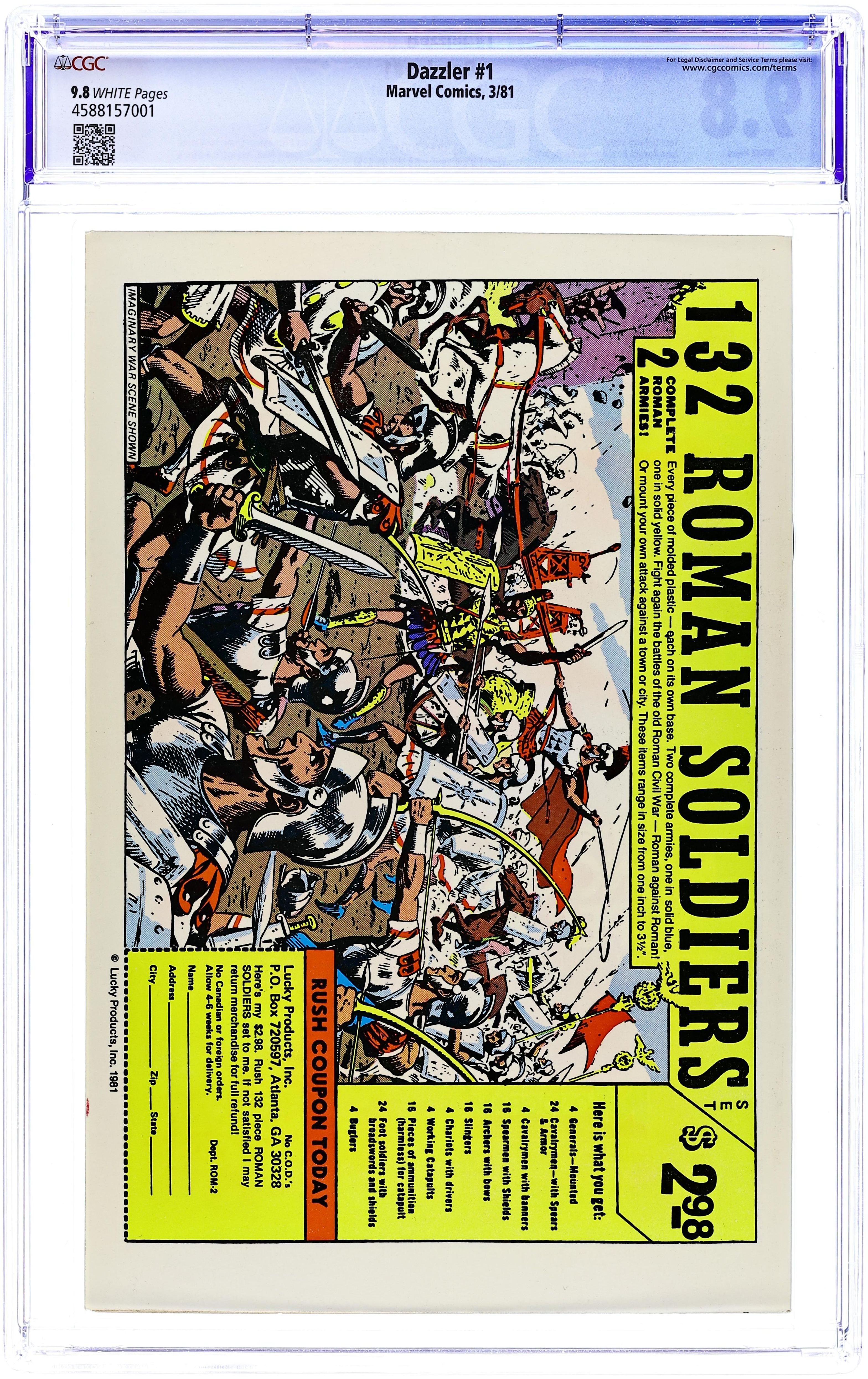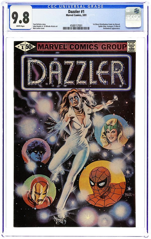 Ended Jul 9 2025 Winning Bid $114 Corrected version with pages 24 & 25 printed in color. Dazzler origin in "So Bright This Star." Script by Tom DeFalco, pencils by John Romite Jr., inks by Alfredo Alcala. Guest appearances by Spider-Man, the X-Men (Storm, Wolverine, Colossus, Nightcrawler, and Sprite), the Avengers (Hawkeye, the Beast, Iron Man, the Wasp, and Captain America), and the Enchantress. This issue was not sold on newsstands, but available only from direst-sale outlets. Bob Larkin painted cover. Cover price $0.50. Grade: CGC 9.8 explanation of grade Condition: Used (collectible)