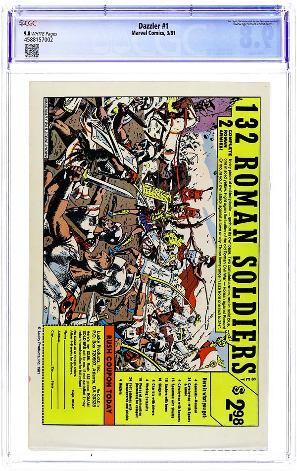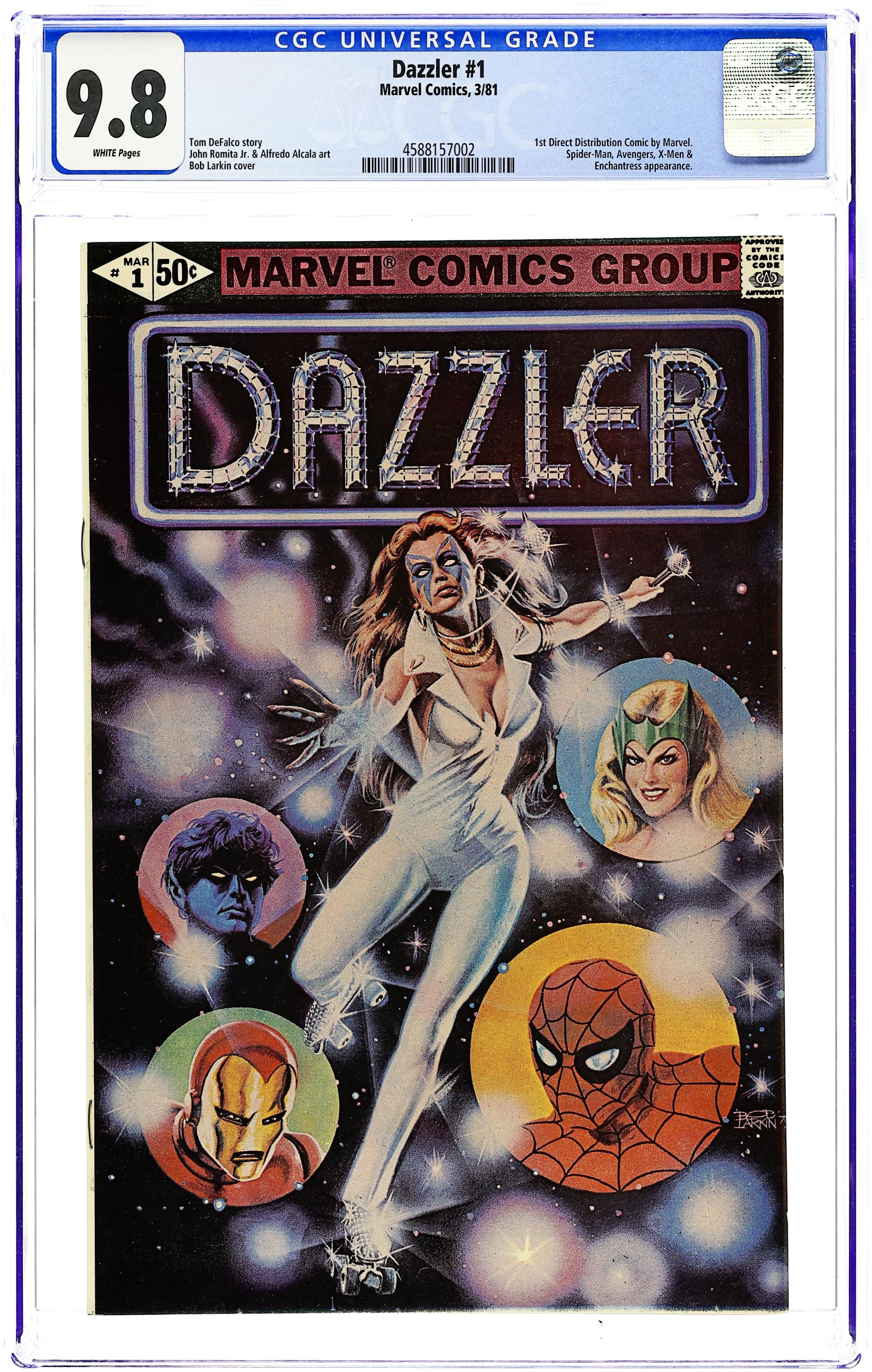 Corrected version with pages 24 & 25 printed in color. Dazzler origin in "So Bright This Star." Script by Tom DeFalco, pencils by John Romite Jr., inks by Alfredo Alcala. Guest appearances by Spider-Man, the X-Men (Storm, Wolverine, Colossus, Nightcrawler, and Sprite), the Avengers (Hawkeye, the Beast, Iron Man, the Wasp, and Captain America), and the Enchantress. This issue was not sold on newsstands, but available only from direst-sale outlets. Bob Larkin painted cover. Cover price $0.50. Grade: CGC 9.8 explanation of grade Condition: Used (collectible)