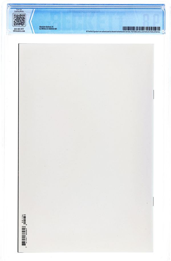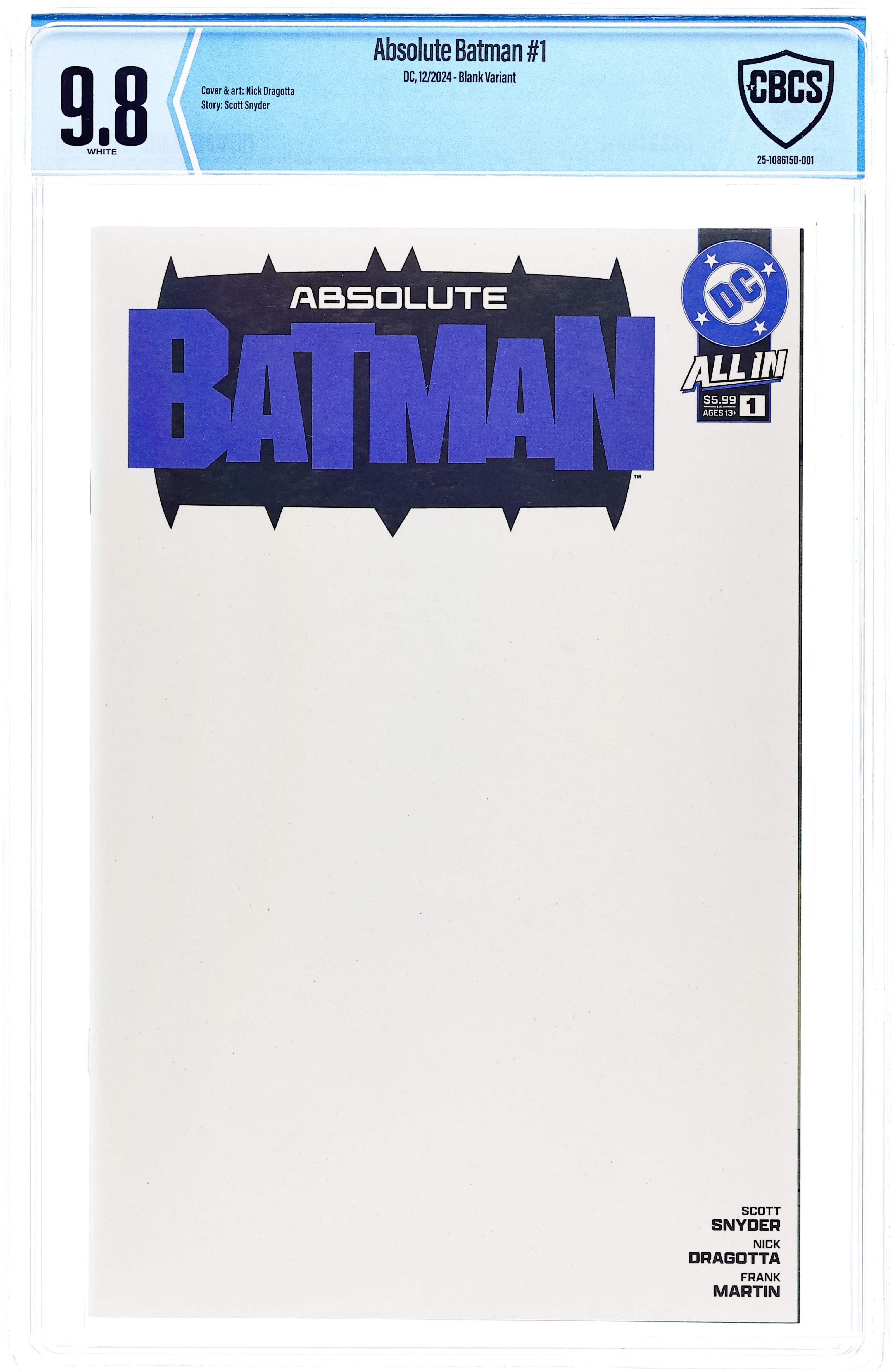 Ended Jul 11 2025 Winning Bid $26 Written by Scott Snyder. Art by Nick Dragotta. Blank Sketch Cover. BATMAN LEGEND SCOTT SNYDER AND ICONIC ARTIST NICK DRAGOTTA TRANSFORM THE DARK KNIGHT'S TALE FOR THE MODERN AGE! Without the mansion...without the money...without the butler...what's left is the Absolute Dark Knight! 48 pages, full color. Rated T+ Cover price $5.99. Grade: CBCS 9.8 explanation of grade Condition: Used (collectible)