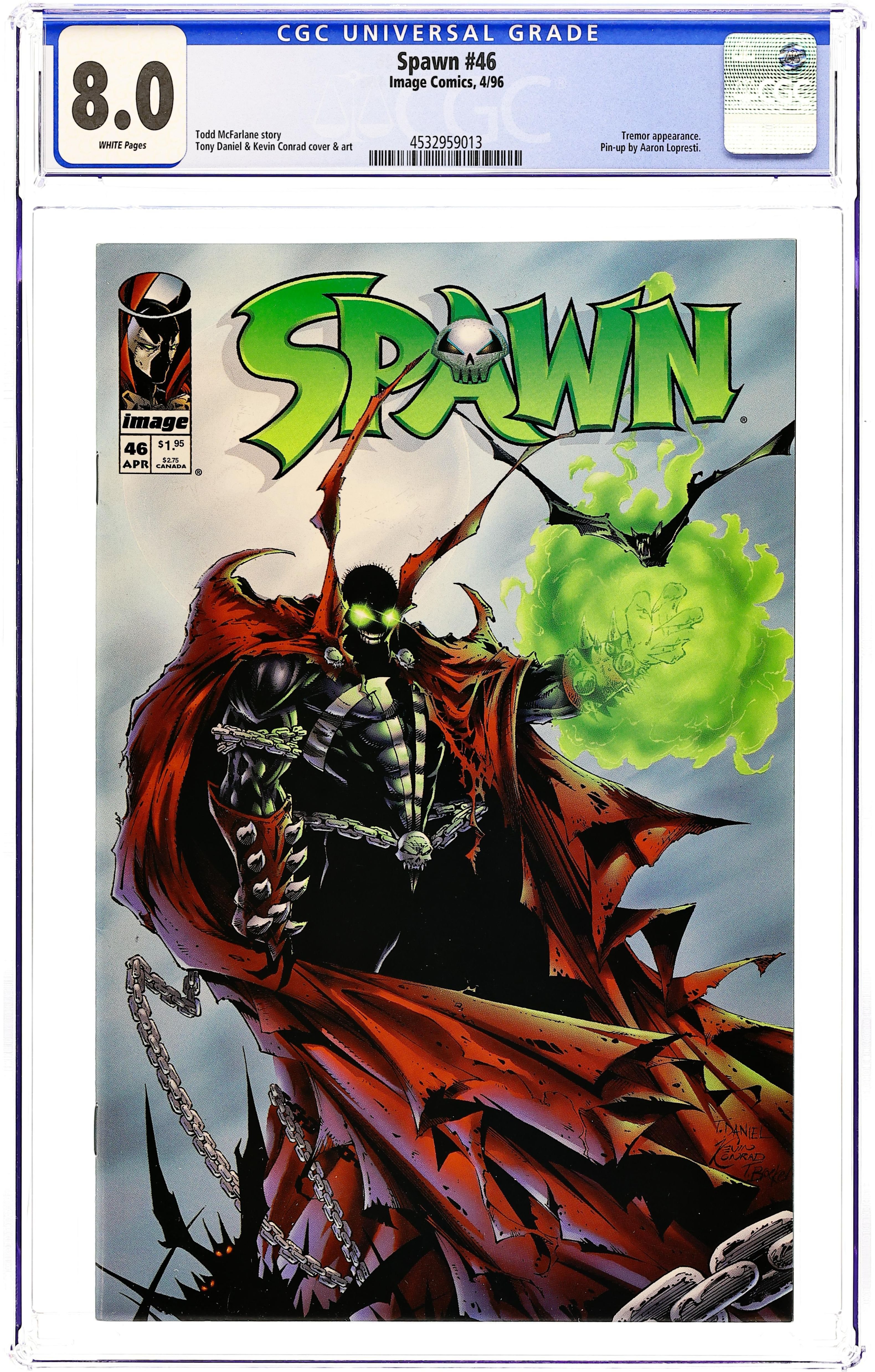 Direct Edition. "Revenge!" Written by Todd McFarlane. Art and cover by Tony Daniel and Kevin Conrad. Mafia leader, Tony Twist, orders an employees execution after suspecting him of stealing, and then receives a call from Sicily demanding the return of Overtkill. Tremor returns to murder two of Twists men before visiting him personally. During their encounter Twist tells Tremor that his brother, David, is still alive. In the alleys of New York, Spawn protects those essential to his existence, the worms, as he rebuilds his power. Spawn learns from Cogliostro that the angels are made of plasma similar to his own, and that Tiffany still lives, as the only way to vanquish an angel is by absorbing her light. Cogliostro reminds Spawn to fight for what is right by opening his mind and learning. Tremor seeks out Spawn for help. Meanwhile, Wanda's work on the new hospital wing progresses and Terry's illness is starting to worsen. 32 pages, FC. NOTE: This issue is dedicated to Frank Frazetta. Cover price $1.95. Grade: CGC 8.0 explanation of grade Condition: Used (collectible)