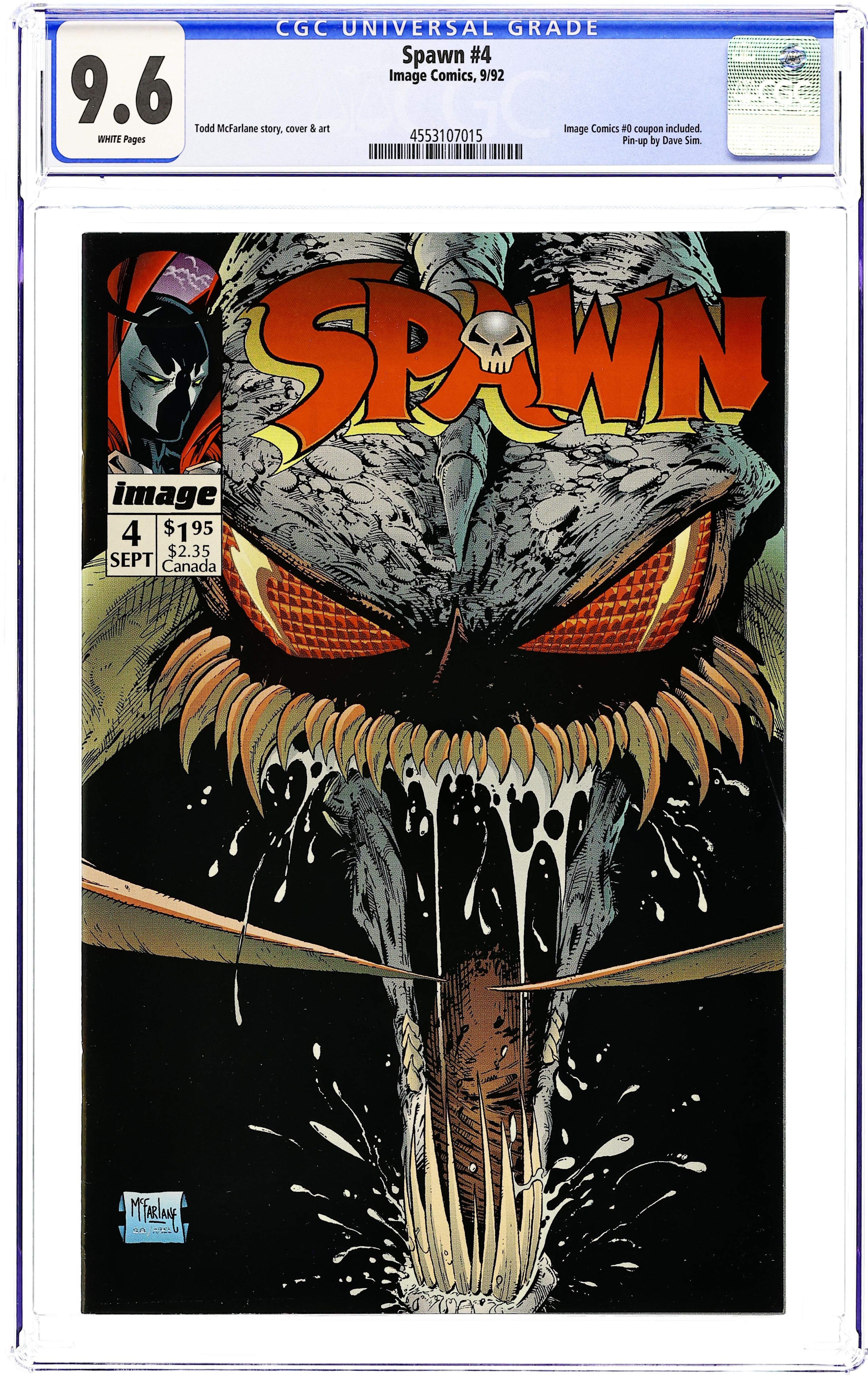 Includes Coupon - "Questions!" Part 4 of 4. Featuring a humorous cameo by the Savage Dragon. Created, story, and art by Todd McFarlane (1-page Dave Sim art; 1-page Whilce Portacio art). Featuring the terrifying conclusion to the first arc, "Question," Spawn proves to be harder to kill then his demonic adversary at first thought. Things take a turn for the worse when the devil Al Simmons made a deal with decides it time to intervene. Version A does include the full page coupon in the middle of the book that could be used to order an Image # 0 mail order comic. Cover price $1.95. Grade: CGC 9.6 explanation of grade Condition: Used (collectible)