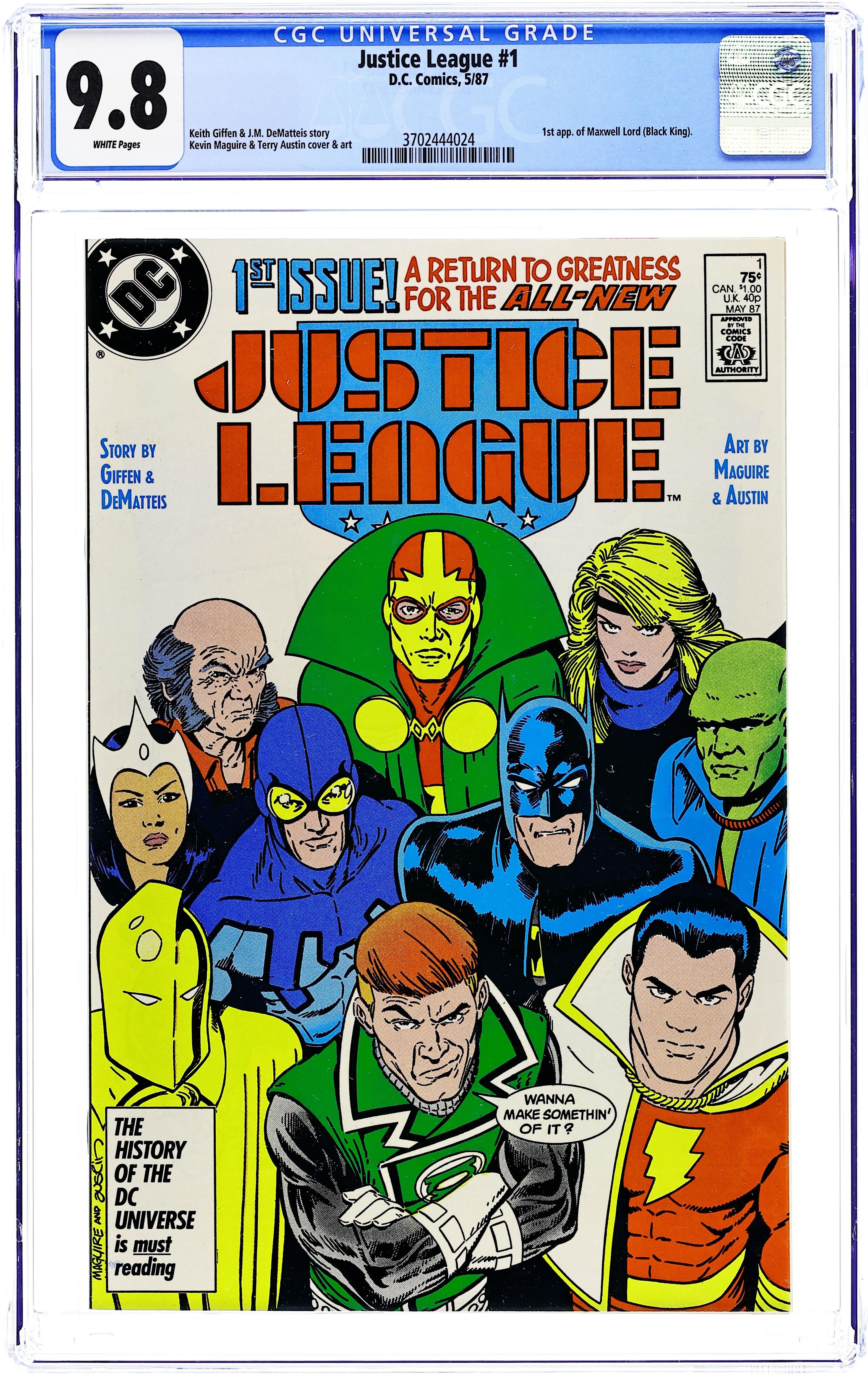 Ended Sep 8 2025 Bid History 14 bids Winning Bid $106 Direct Edition. When terrorists take the U.N. General Assembly hostage, Doctor Light (Kimiyo Hoshi) calls on the newly formed Justice League for help in "Born Again". Plot and breakdowns by Keith Giffen, script by Giffen and J.M. DeMatteis, pencils by Kevin Maguire, inks by Terry Austin. Batman, Guy Gardner, Black Canary, Mr. Miracle, Oberon, Captain Marvel, Martian Manhunter, Blue Beetle, Dr. Fate, Maxwell Lord. Maguire/Austin cover. Cover price $0.75. Grade: CGC 9.8 explanation of grade Condition: Used (collectible)