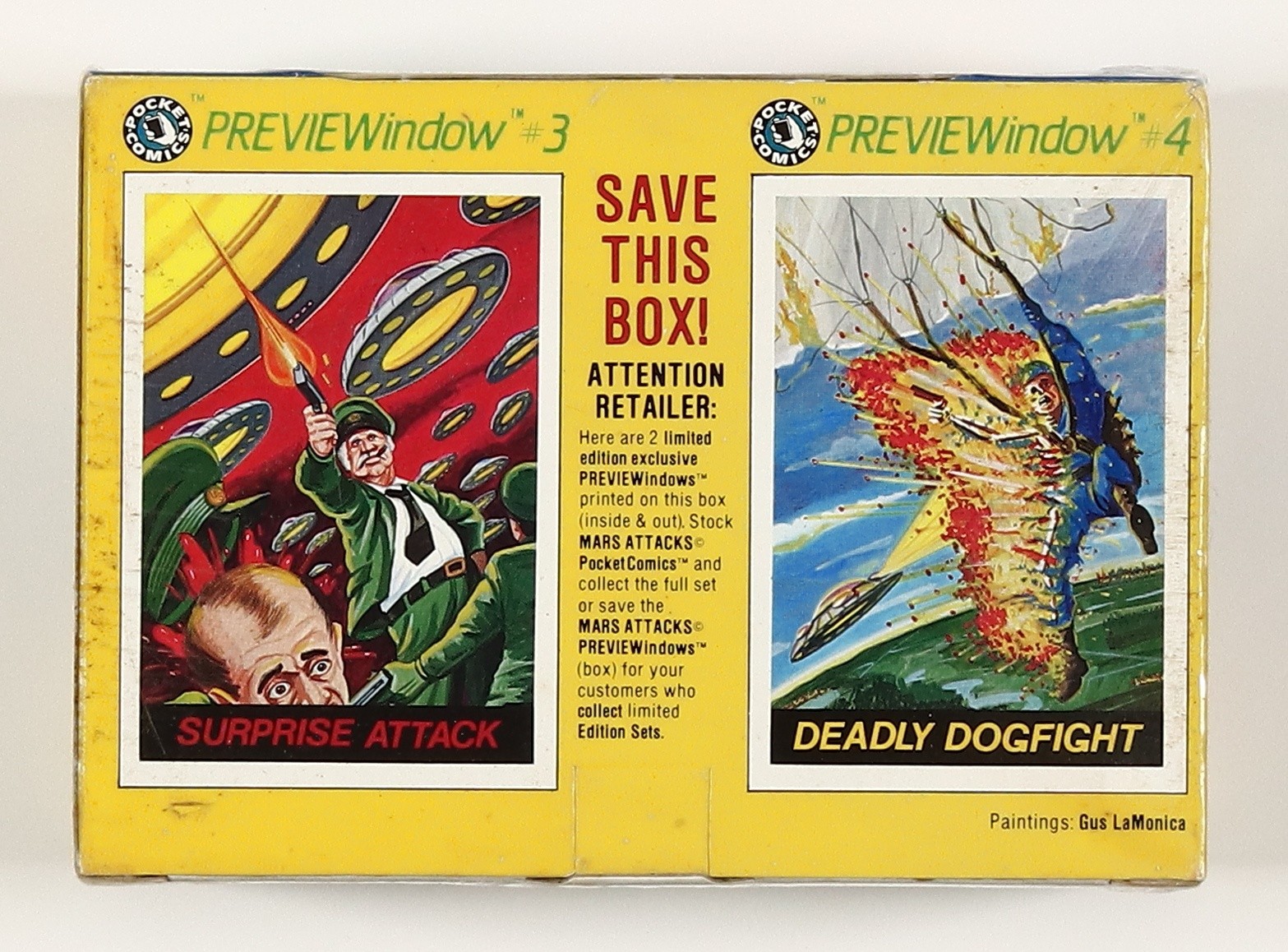Includes 25 copies each of issues 3 and 4 of the Mars Attacks Mini Comics from 1988 produced by Pocket Comics. 6 1/2" x 2 1/2" x 4 1/2".