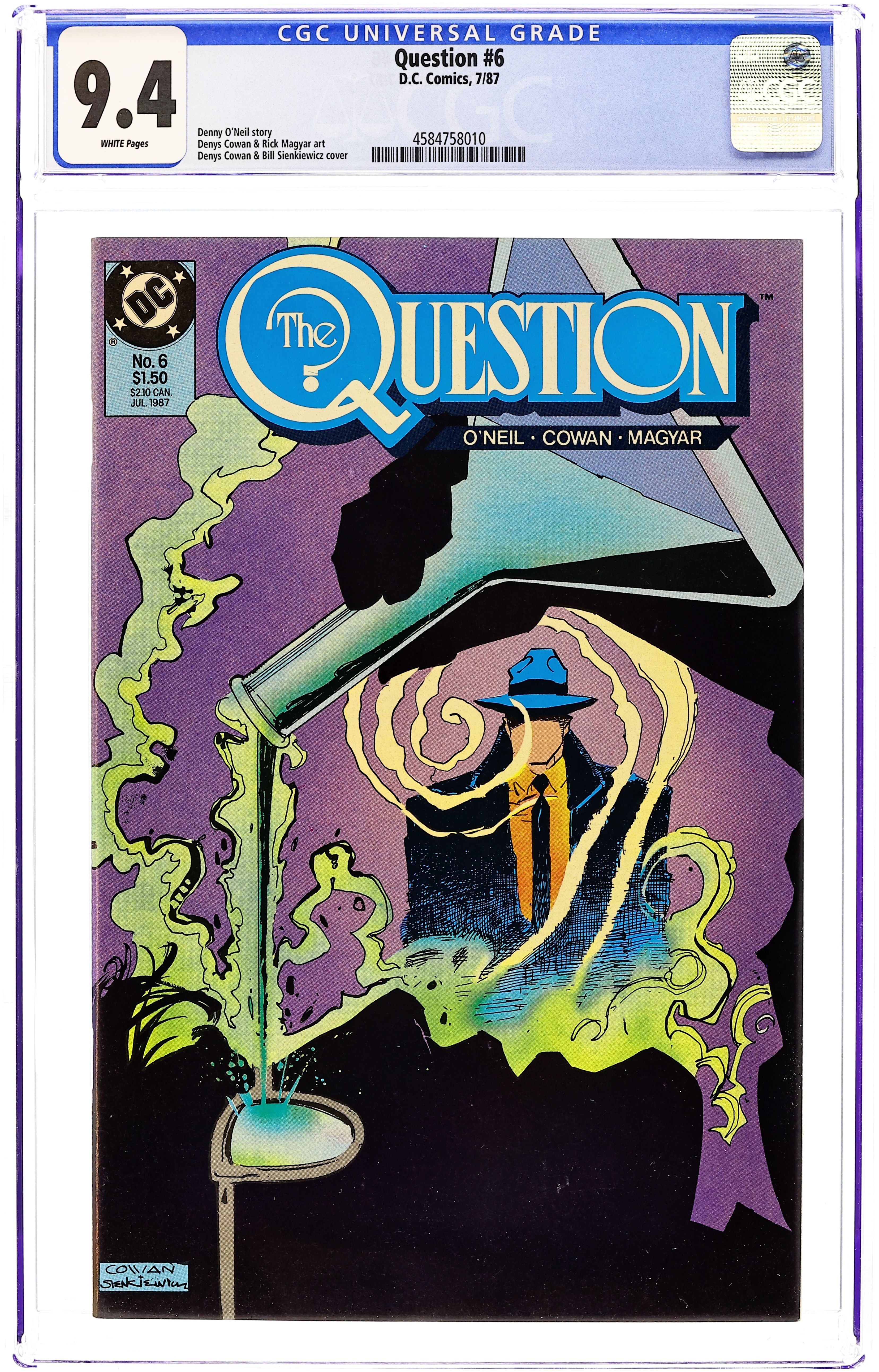 Ended Jul 28 2025 Bid History 8 bids Winning Bid $16 Cover pencils by Denys Cowan, inks by Bill Sienkiewicz. ...That Small Rain Down Can Rain..., script by Dennis O'Neil, pencils by Denys Cowan, inks by Rick Magyar; Junior pours acid on his face in hopes that it will make his father love him; The Question tries to stop Benno and Farley from killing the latter's father for mucking up an arms deal. Suggested for Mature Readers. Deluxe format. 36 pgs. $1.50. Cover price $1.50. Grade: CGC 9.4 explanation of grade Condition: Used (collectible)