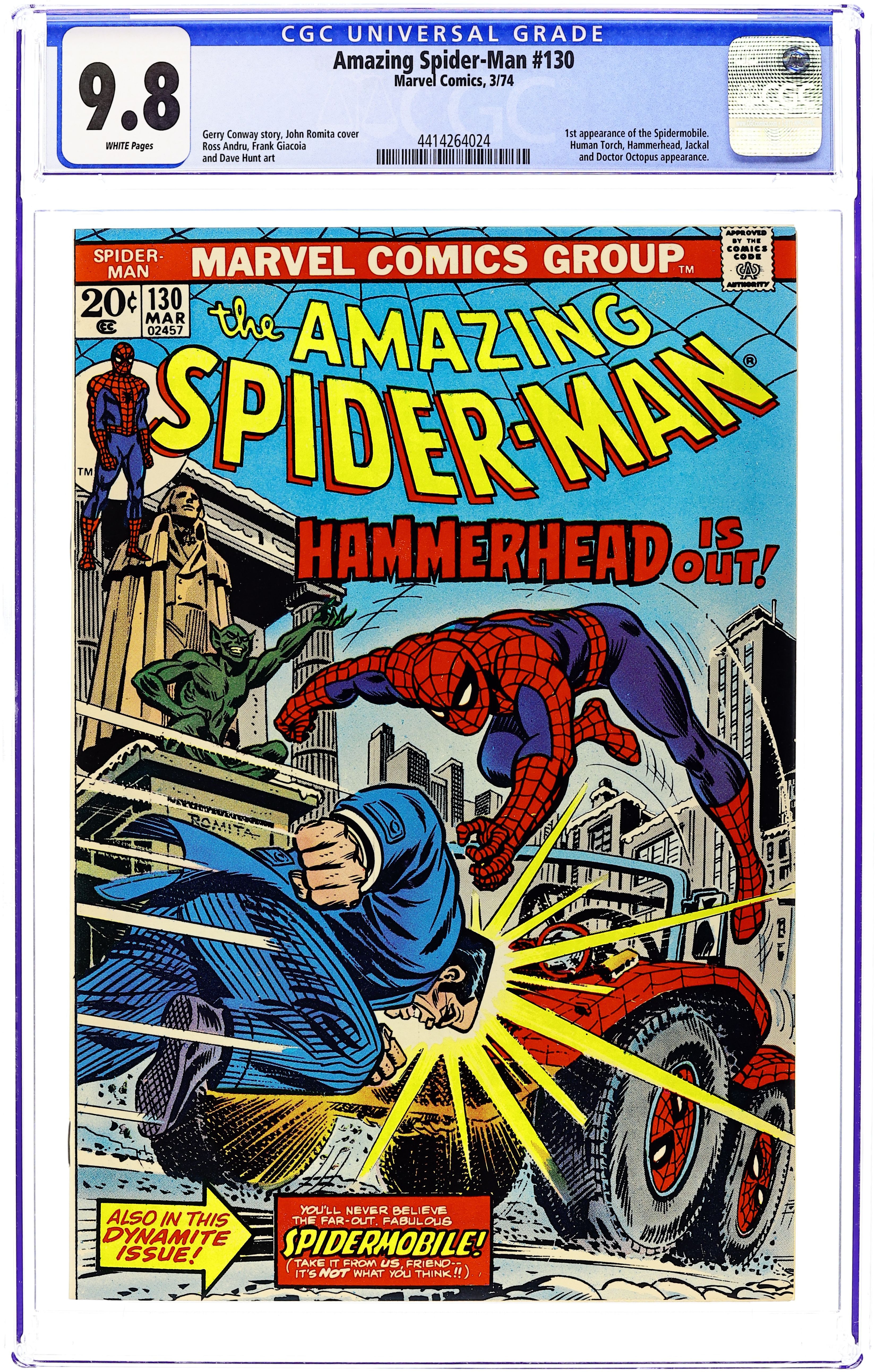 "Betrayed!" Part 1 of 2. Guest-starring the Human Torch. Script by Gerry Conway. Pencils by Ross Andru. Inks by Frank Giacoia and Dave Hunt (backgrounds). Cover by John Romita and Tony Mortellaro. It's the first appearance of the Spider-Mobile! The web-slinger's new toy to fight crime! But while Spidey speeds around town in his fresh set of wheels; the Jackal, Hammerhead, and Doctor Octopus separately plot his demise! By the time the wall-crawler slows down, he realizes that his dear Aunt May is about to make the biggest mistake of her life...with Doc Ock! The amazing one sends his RSVP next issue! Cameo appearances by Mary Jane Watson, Betty Brant, Ned Leeds, and J. Jonah Jameson. (Notes: Hammerhead and Dr. Octopus both previously appeared in Amazing Spider-Man 115. The letters page includes Marvel Value Stamp series A #2 Hulk by Herb Trimpe. The bullpen bonus page contains promotional stamp #5 the Hulk. The promotional stamp is not to be confused with the actual series A stamp #5. This story was reprinted in Marvel Tales 107.) 36 pages. 20 cent cover price. Cover price $0.20. Grade: CGC 9.8 explanation of grade Condition: Used (collectible)