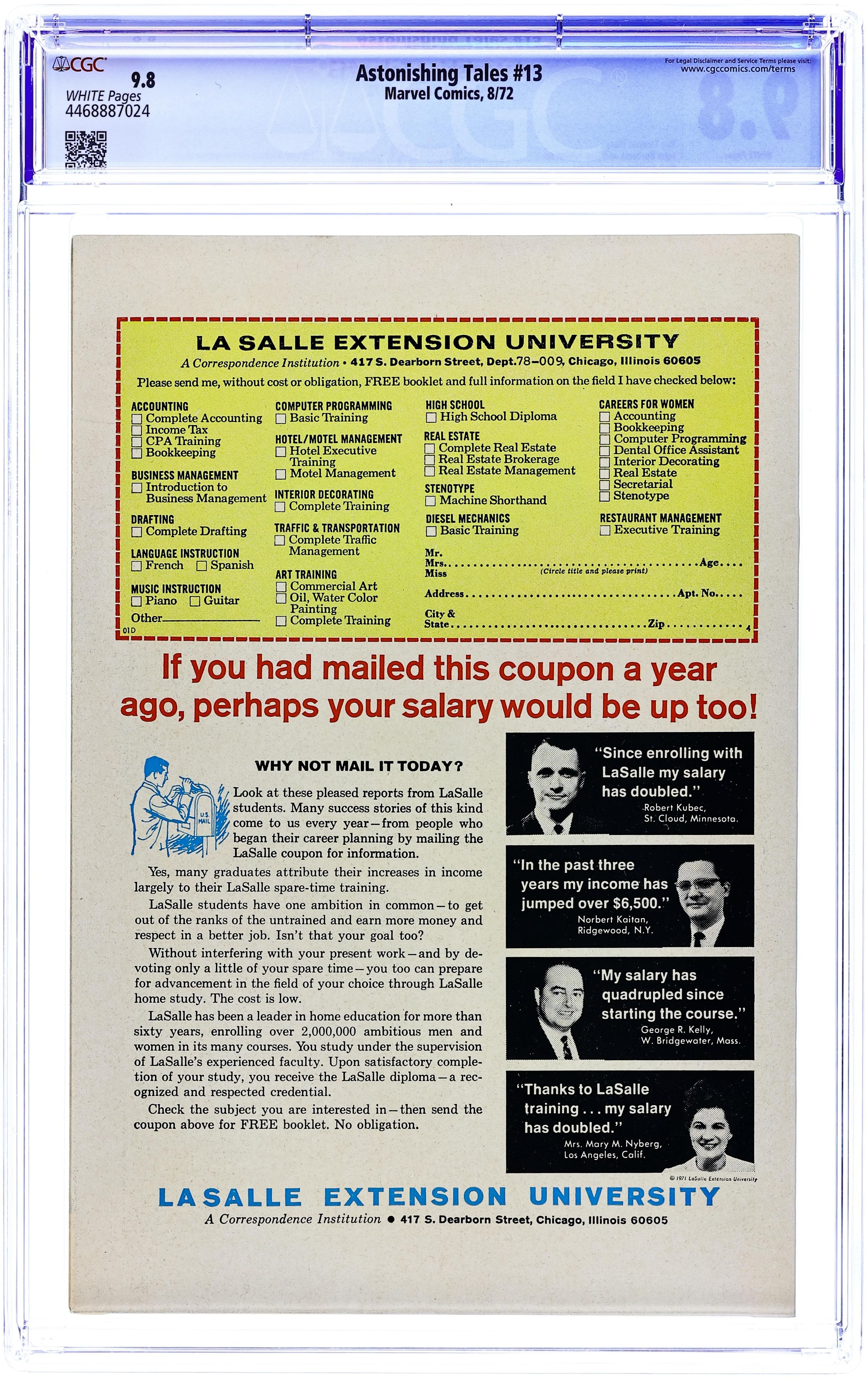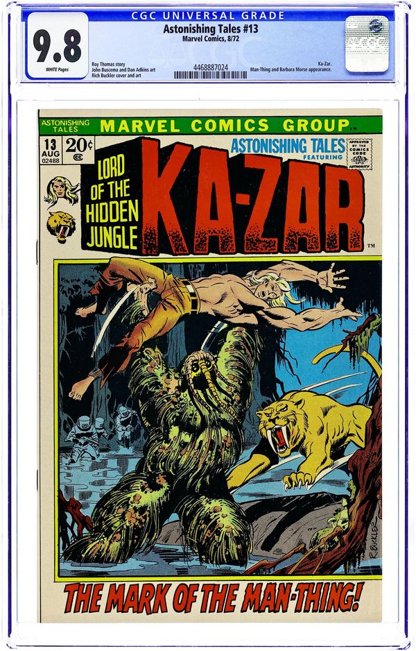 Cover art by Rich Buckler. Man-Thing!, script by Roy Thomas, pencils by Rich Buckler (pages 1-6) and John Buscema (pages 7-20), inks by Dan Adkins; Ka-Zar (with the help of AIM) manages to capture the Man-Thing and he is transported to the lab; He escapes and follows Ka-Zar and Barbara Morris when they go searching for the kidnapped Dr. Calvin; They find and save Dr. Calvin but the traitorous Paul Allen is killed by the Man-Thing. 32 pgs. $0.20. Cover price $0.20. Grade: CGC 9.8 explanation of grade Condition: Used (collectible)