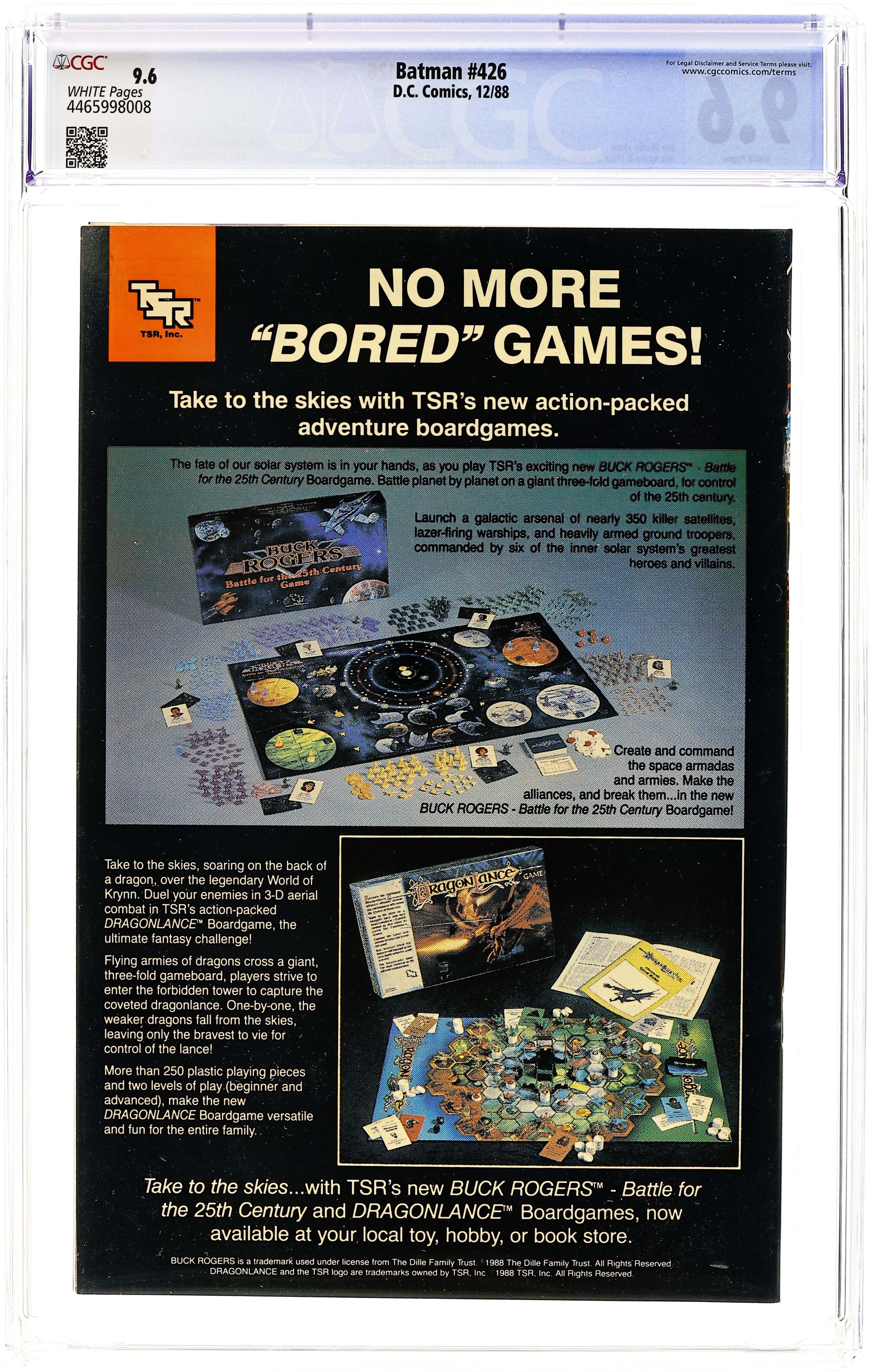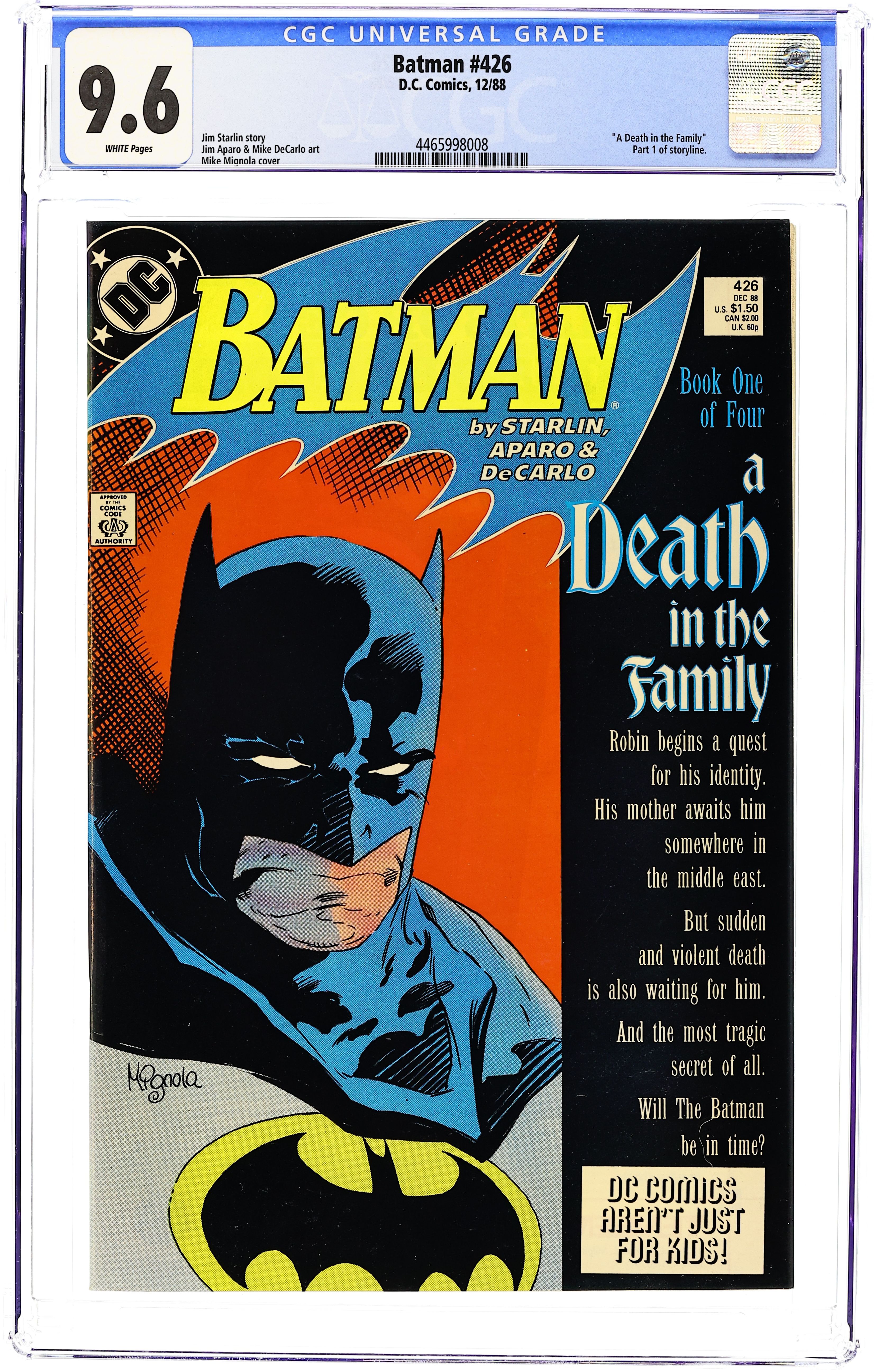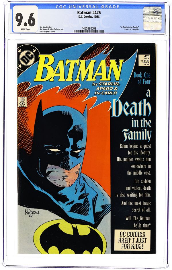 Ended Aug 11 2025 Bid History 14 bids Winning Bid $42 First printing. Direct Edition. Cover art by Mike Mignola. "A Death in the Family" part 1 of 4, script by Jim Starlin, pencils by Jim Aparo, inks by Mike DeCarlo; Jason discovers that his "real" mother was really his step-mother, and his birth mother is still alive; Joker escapes from Arkham and Batman chases him to the Middle East where he runs across Jason looking for one of the women he thinks is his mom. Infamous story where readers called an 800 number, and 'voted' to have Robin killed! Story continues in Batman #427. NOTE: Most issues from 397-432 were reprinted in 1989 and sold in multipacks. These 2nd and 3rd prints have back cover ads dated 1989. 52 Pages, Full Color. Cover price $1.50. Grade: CGC 9.6 explanation of grade Condition: Used (collectible)